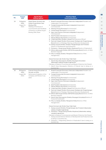 No. TanggalDateAgenda RapatMeeting AgendaKehadiran RapatMeeting Attendance25 16 Agustus 2024August 16, 2024Rapat Dewan Komisaris dan Direksi Proyek Bintan Fase Binding OfferMeeting of the Board of Commissioners and the Board of Directors on Bintan Project Binding Offer Phase1. Rinadi Firmansyah (Komisaris Utama dan Independen/President and Independent Commissioner) 2. Tumpak Simanjuntak (Komisaris Indepeden/Independent Commissioner)3. Nanang Untung (Komisaris/Commissioner)4. Tutuka Ariadji (Komisaris/Commissioner) 5. Agus Joko Pramono (Komisaris Indepeden/Independent Commissioner)6. Abdi Mustakim (Komisaris/Commissioner)7. Paiman Raharjo (Komisaris/Commissioner)8. Chalid Said Salim (Direktur Utama/Chief Executive Officer)9. Rachmat Hidajat (Direktur Perencanaan Strategis dan Pengembangan Bisnis/Director of Strategic Planning and Business Development)10. Awang Lazuardi Direktur (Direktur Pengembangan dan Produksi/Director of Development and Production)11. Muharram J. Panguriseng (Direktur Eksplorasi/Director of Exploration)12. Whisnu Bahransyah (Direkur SDM & Penunjang Bisnis/Director of HR & Business Support)13. Mery Luciawaty (Direktur Manajemen Risiko/Director of Risk Management)Dewan Komisaris dan Direksi Yang Tidak Hadir:1. Dannif Utojo Danusaputro (Direktur Keuangan & Investasi) dikarenakan sedang mengikuti agenda lainMembers of Board of Commissioners and Board of Directors Not Present:1. Dannif Utojo Danusaputro (Director of Finance) due to being on a business trip26 28 Agustus 2024August 28, 2024Evaluasi Kinerja Perusahaan s.d Periode Juli 2024Performance Evaluation of the Company until Period of July 2024 1. Rinadi Firmansyah (Komisaris Utama dan Independen/President and Independent Commissioner) 2. Tumpak Simanjuntak (Komisaris Indepeden/Independent Commissioner)3. Nanang Untung (Komisaris/Commissioner)4. Tutuka Ariadji (Komisaris/Commissioner) 5. Agus Joko Pramono (Komisaris Indepeden/Independent Commissioner)6. Abdi Mustakim (Komisaris/Commissioner)7. Paiman Raharjo (Komisaris/Commissioner)8. Chalid Said Salim (Direktur Utama/Chief Executive Officer)9. Rachmat Hidajat (Direktur Perencanaan Strategis dan Pengembangan Bisnis/Director of Strategic Planning and Business Development)10. Whisnu Bahransyah (Direkur SDM & Penunjang Bisnis/Director of HR & Business Support)11. Dannif Utojo Danusaputro (Direktur Keuangan & Investasi/Director of Finance & Investment)12. Mery Luciawaty (Direktur Manajemen Risiko/Director of Risk Management)Dewan Komisaris dan Direksi Yang Tidak Hadir:1. Awang Lazuardi (Direktur Pengembangan dan Produksi) dikarenakan sedang mengikuti agenda lain2. Muharram J. Pangurinseng (Direktur Eksplorasi) dikarenakan sedang mengikuti agenda lainMembers of Board of Commissioners and Board of Directors Not Present:1. Awang Lazuardi Director (Director of Development and Production) due to being on a business trip2. Muharram J. Panguriseng (Director of Exploration) due to being on a business trip0102030405 Good Corporate Governance Tata kelola Perusahaan0607 PT Pertamina Hulu Energi 413