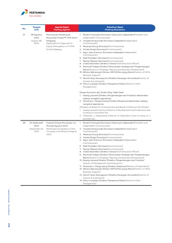 No. TanggalDateAgenda RapatMeeting AgendaKehadiran RapatMeeting Attendance27 28 Agustus 2024August 28, 2024Permohonan Persetujuan Penyertaan Modal PT PHE North KetapangApplication for Approval for Equity Participation in PT PHE North Ketapang1. Rinadi Firmansyah (Komisaris Utama dan Independen/President and Independent Commissioner) 2. Tumpak Simanjuntak (Komisaris Indepeden/Independent Commissioner)3. Nanang Untung (Komisaris/Commissioner)4. Tutuka Ariadji (Komisaris/Commissioner) 5. Agus Joko Pramono (Komisaris Indepeden/Independent Commissioner)6. Abdi Mustakim (Komisaris/Commissioner)7. Paiman Raharjo (Komisaris/Commissioner)8. Chalid Said Salim (Direktur Utama/Chief Executive Officer)9. Rachmat Hidajat (Direktur Perencanaan Strategis dan Pengembangan Bisnis/Director of Strategic Planning and Business Development)10. Whisnu Bahransyah (Direkur SDM & Penunjang Bisnis/Director of HR & Business Support)11. Dannif Utojo Danusaputro (Direktur Keuangan & Investasi/Director of Finance & Investment)12. Mery Luciawaty (Direktur Manajemen Risiko/Director of Risk Management)Dewan Komisaris dan Direksi Yang Tidak Hadir:1. Awang Lazuardi (Direktur Pengembangan dan Produksi) dikarenakan sedang mengikuti agenda lain2. Muharram J. Pangurinseng (Direktur Eksplorasi) dikarenakan sedang mengikuti agenda lainMembers of Board of Commissioners and Board of Directors Not Present:1. Awang Lazuardi Director (Director of Development and Production) due to being on a business trip2. Muharram J. Panguriseng (Director of Exploration) due to being on a business trip28 24 September 2024September 24, 2024Evaluasi Kinerja Perusahaan s.d Periode Agustus 2024Performance Evaluation of the Company until Period of August 2024 1. Rinadi Firmansyah (Komisaris Utama dan Independen/President and Independent Commissioner) 2. Tumpak Simanjuntak (Komisaris Indepeden/Independent Commissioner)3. Nanang Untung (Komisaris/Commissioner)4. Tutuka Ariadji (Komisaris/Commissioner) 5. Agus Joko Pramono (Komisaris Indepeden/Independent Commissioner)6. Abdi Mustakim (Komisaris/Commissioner)7. Paiman Raharjo (Komisaris/Commissioner)8. Chalid Said Salim (Direktur Utama/Chief Executive Officer)9. Rachmat Hidajat (Direktur Perencanaan Strategis dan Pengembangan Bisnis/Director of Strategic Planning and Business Development)10. Awang Lazuardi Direktur (Direktur Pengembangan dan Produksi/Director of Development and Production)11. Muharram J. Panguriseng (Direktur Eksplorasi/Director of Exploration)12. Whisnu Bahransyah (Direkur SDM & Penunjang Bisnis/Director of HR & Business Support)13. Dannif Utojo Danusaputro (Direktur Keuangan & Investasi/Director of Finance & Investment)14. Mery Luciawaty (Direktur Manajemen Risiko/Director of Risk Management)Laporan Tahunan %u2022 Annual Report 414HULU ENERGI