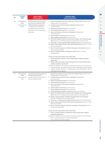 No. TanggalDateAgenda RapatMeeting AgendaKehadiran RapatMeeting Attendance33 19 November 2024November 19, 2024Konsinyering Penyusunan Key Performance Indicator (KPI) 2025 Subholding UpstreamConsignment of Drafting of Key Performance Indicators (KPI) 2025 of the Subholding Upstream1. Rinadi Firmansyah (Komisaris Utama dan Independen/President and Independent Commissioner) 2. Tumpak Simanjuntak (Komisaris Indepeden/Independent Commissioner)3. Nanang Untung (Komisaris/Commissioner)4. Tutuka Ariadji (Komisaris/Commissioner) 5. Agus Joko Pramono (Komisaris Indepeden/Independent Commissioner)6. Abdi Mustakim (Komisaris/Commissioner)7. Paiman Raharjo (Komisaris/Commissioner)8. Rachmat Hidajat (Direktur Perencanaan Strategis dan Pengembangan Bisnis/Director of Strategic Planning and Business Development)9. Muharram J. Panguriseng (Direktur Eksplorasi/Director of Exploration)10. Whisnu Bahransyah (Direkur SDM & Penunjang Bisnis/Director of HR & Business Support)11. Dannif Utojo Danusaputro (Direktur Keuangan & Investasi/Director of Finance & Investment)12. Mery Luciawaty (Direktur Manajemen Risiko/Director of Risk Management)Dewan Komisaris dan Direksi Yang Tidak Hadir:1. Chalid Said Salim (Direktur Utama) dikarenakan sedang mengikuti agenda lain2. Awang Lazuardi (Direktur Pengembangan dan Produksi) dikarenakan sedang mengikuti agenda lainMembers of Board of Commissioners and Board of Directors Not Present:1. Chalid Said Salim (President Director) due to attending another agenda2. Awang Lazuardi (Director of Development and Production) due to attending another agenda34 22 November 2024November 22, 2024Evaluasi Kinerja Perusahaan s.d Periode Oktober 2024Evaluasi Kinerja Perusahaan s.d Periode Oktober 20241. Rinadi Firmansyah (Komisaris Utama dan Independen/President and Independent Commissioner) 2. Tumpak Simanjuntak (Komisaris Indepeden/Independent Commissioner)3. Nanang Untung (Komisaris/Commissioner)4. Tutuka Ariadji (Komisaris/Commissioner) 5. Agus Joko Pramono (Komisaris Indepeden/Independent Commissioner)6. Abdi Mustakim (Komisaris/Commissioner)7. Paiman Raharjo (Komisaris/Commissioner)8. Chalid Said Salim (Direktur Utama/Chief Executive Officer)9. Rachmat Hidajat (Direktur Perencanaan Strategis dan Pengembangan Bisnis/Director of Strategic Planning and Business Development)10. Awang Lazuardi Direktur (Direktur Pengembangan dan Produksi/Director of Development and Production)11. Muharram J. Panguriseng (Direktur Eksplorasi/Director of Exploration)12. Whisnu Bahransyah (Direkur SDM & Penunjang Bisnis/Director of HR & Business Support)13. Dannif Utojo Danusaputro (Direktur Keuangan & Investasi/Director of Finance & Investment)Dewan Komisaris dan Direksi Yang Tidak Hadir:1. Mery Luciawaty (Direktur Manajemen Risiko) dikarenakan sedang mengikuti agenda lainMembers of Board of Commissioners and Board of Directors Not Present:1. Mery Luciawaty (Director of Risk Management) due to attending another agenda0102030405 Good Corporate Governance Tata kelola Perusahaan0607 PT Pertamina Hulu Energi 417