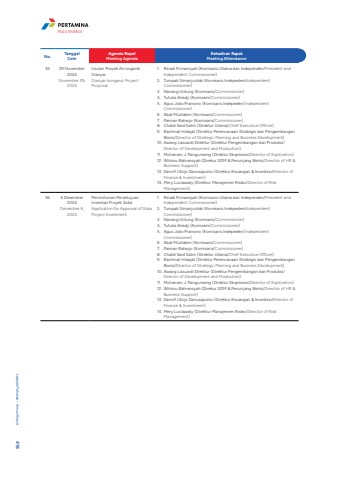 No. TanggalDateAgenda RapatMeeting AgendaKehadiran RapatMeeting Attendance35 29 November 2024November 29, 2024Usulan Proyek An-organik GianyarGianyar Inorganic Project Proposal1. Rinadi Firmansyah (Komisaris Utama dan Independen/President and Independent Commissioner) 2. Tumpak Simanjuntak (Komisaris Indepeden/Independent Commissioner)3. Nanang Untung (Komisaris/Commissioner)4. Tutuka Ariadji (Komisaris/Commissioner) 5. Agus Joko Pramono (Komisaris Indepeden/Independent Commissioner)6. Abdi Mustakim (Komisaris/Commissioner)7. Paiman Raharjo (Komisaris/Commissioner)8. Chalid Said Salim (Direktur Utama/Chief Executive Officer)9. Rachmat Hidajat (Direktur Perencanaan Strategis dan Pengembangan Bisnis/Director of Strategic Planning and Business Development)10. Awang Lazuardi Direktur (Direktur Pengembangan dan Produksi/Director of Development and Production)11. Muharram J. Panguriseng (Direktur Eksplorasi/Director of Exploration)12. Whisnu Bahransyah (Direkur SDM & Penunjang Bisnis/Director of HR & Business Support)13. Dannif Utojo Danusaputro (Direktur Keuangan & Investasi/Director of Finance & Investment)14. Mery Luciawaty (Direktur Manajemen Risiko/Director of Risk Management)36 6 Desember 2024December 6, 2024Permohonan Persetujuan Investasi Proyek SokaApplication for Approval of Soka Project Investment 1. Rinadi Firmansyah (Komisaris Utama dan Independen/President and Independent Commissioner) 2. Tumpak Simanjuntak (Komisaris Indepeden/Independent Commissioner)3. Nanang Untung (Komisaris/Commissioner)4. Tutuka Ariadji (Komisaris/Commissioner) 5. Agus Joko Pramono (Komisaris Indepeden/Independent Commissioner)6. Abdi Mustakim (Komisaris/Commissioner)7. Paiman Raharjo (Komisaris/Commissioner)8. Chalid Said Salim (Direktur Utama/Chief Executive Officer)9. Rachmat Hidajat (Direktur Perencanaan Strategis dan Pengembangan Bisnis/Director of Strategic Planning and Business Development)10. Awang Lazuardi Direktur (Direktur Pengembangan dan Produksi/Director of Development and Production)11. Muharram J. Panguriseng (Direktur Eksplorasi/Director of Exploration)12. Whisnu Bahransyah (Direkur SDM & Penunjang Bisnis/Director of HR & Business Support)13. Dannif Utojo Danusaputro (Direktur Keuangan & Investasi/Director of Finance & Investment)14. Mery Luciawaty (Direktur Manajemen Risiko/Director of Risk Management)Laporan Tahunan %u2022 Annual Report 418HULU ENERGI