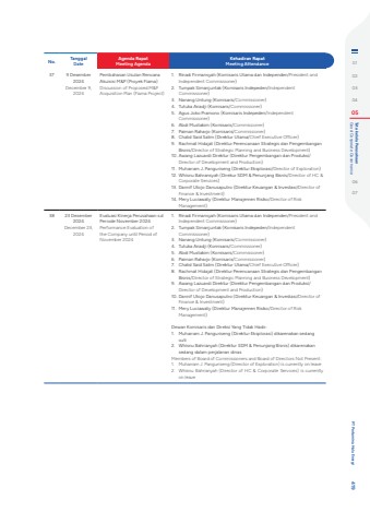 No. TanggalDateAgenda RapatMeeting AgendaKehadiran RapatMeeting Attendance37 9 Desember 2024December 9, 2024Pembahasan Usulan Rencana Akuisisi M&P (Proyek Fiama)Discussion of Proposed M&P Acquisition Plan (Fiama Project)1. Rinadi Firmansyah (Komisaris Utama dan Independen/President and Independent Commissioner) 2. Tumpak Simanjuntak (Komisaris Indepeden/Independent Commissioner)3. Nanang Untung (Komisaris/Commissioner)4. Tutuka Ariadji (Komisaris/Commissioner) 5. Agus Joko Pramono (Komisaris Indepeden/Independent Commissioner)6. Abdi Mustakim (Komisaris/Commissioner)7. Paiman Raharjo (Komisaris/Commissioner)8. Chalid Said Salim (Direktur Utama/Chief Executive Officer)9. Rachmat Hidajat (Direktur Perencanaan Strategis dan Pengembangan Bisnis/Director of Strategic Planning and Business Development)10. Awang Lazuardi Direktur (Direktur Pengembangan dan Produksi/Director of Development and Production)11. Muharram J. Panguriseng (Direktur Eksplorasi/Director of Exploration)12. Whisnu Bahransyah (Direkur SDM & Penunjang Bisnis/Director of HC & Corporate Services)13. Dannif Utojo Danusaputro (Direktur Keuangan & Investasi/Director of Finance & Investment)14. Mery Luciawaty (Direktur Manajemen Risiko/Director of Risk Management)38 23 Desember 2024December 23, 2024Evaluasi Kinerja Perusahaan s.d Periode November 2024Performance Evaluation of the Company until Period of November 2024 1. Rinadi Firmansyah (Komisaris Utama dan Independen/President and Independent Commissioner) 2. Tumpak Simanjuntak (Komisaris Indepeden/Independent Commissioner)3. Nanang Untung (Komisaris/Commissioner)4. Tutuka Ariadji (Komisaris/Commissioner) 5. Abdi Mustakim (Komisaris/Commissioner)6. Paiman Raharjo (Komisaris/Commissioner)7. Chalid Said Salim (Direktur Utama/Chief Executive Officer)8. Rachmat Hidajat (Direktur Perencanaan Strategis dan Pengembangan Bisnis/Director of Strategic Planning and Business Development)9. Awang Lazuardi Direktur (Direktur Pengembangan dan Produksi/Director of Development and Production)10. Dannif Utojo Danusaputro (Direktur Keuangan & Investasi/Director of Finance & Investment)11. Mery Luciawaty (Direktur Manajemen Risiko/Director of Risk Management)Dewan Komisaris dan Direksi Yang Tidak Hadir:1. Muharram J. Panguriseng (Direktur Eksplorasi) dikarenakan sedang cuti2. Whisnu Bahrianyah (Direktur SDM & Penunjang Bisnis) dikarenakan sedang dalam perjalanan dinasMembers of Board of Commissioners and Board of Directors Not Present:1. Muharram J. Panguriseng (Director of Exploration) is currently on leave2. Whisnu Bahrianyah (Director of HC & Corporate Services) is currently on leave0102030405 Good Corporate Governance Tata kelola Perusahaan0607 PT Pertamina Hulu Energi 419