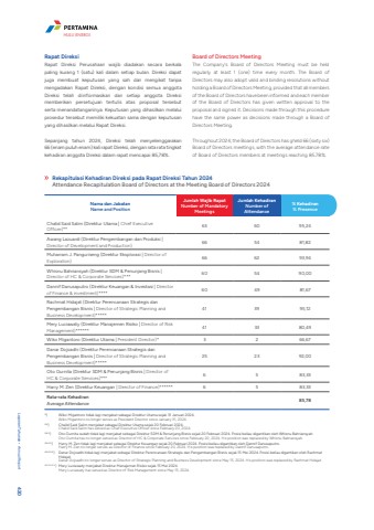 Rapat DireksiRapat Direksi Perusahaan wajib diadakan secara berkala paling kurang 1 (satu) kali dalam setiap bulan. Direksi dapat juga membuat keputusan yang sah dan mengikat tanpa mengadakan Rapat Direksi, dengan kondisi semua anggota Direksi telah diinformasikan dan setiap anggota Direksi memberikan persetujuan tertulis atas proposal tersebut serta menandatanganinya. Keputusan yang dihasilkan melalui prosedur tersebut memiliki kekuatan sama dengan keputusan yang dihasilkan melalui Rapat Direksi.Sepanjang tahun 2024, Direksi telah menyelenggarakan 66 (enam puluh enam) kali rapat Direksi, dengan rata rata tingkat kehadiran anggota Direksi dalam rapat mencapai 85,78%.Board of Directors MeetingThe Company's Board of Directors Meeting must be held regularly at least 1 (one) time every month. The Board of Directors may also adopt valid and binding resolutions without holding a Board of Directors Meeting, provided that all members of the Board of Directors have been informed and each member of the Board of Directors has given written approval to the proposal and signed it. Decisions made through this procedure have the same power as decisions made through a Board of Directors Meeting.Throughout 2024, the Board of Directors has gheld 66 (sixty six) Board of Directors meetings, with the average attendance rate of Board of Directors members at meetings reaching 85.78%.Rekapitulasi Kehadiran Direksi pada Rapat Direksi Tahun 2024Attendance Recapitulation Board of Directors at the Meeting Board of Directors 2024Nama dan JabatanName and PositionJumlah Wajib RapatNumber of Mandatory MeetingsJumlah KehadiranNumber of Attendance% Kehadiran% PresenceChalid Said Salim (Direktur Utama | Chief Executive Officer)** 63 60 95,24Awang Lazuardi (Direktur Pengembangan dan Produksi | Director of Development and Production) 66 54 81,82Muharram J. Panguriseng (Direktur Eksplorasi | Director of Exploration) 66 62 93,94Whisnu Bahriansyah (Direktur SDM & Penunjang Bisnis | Director of HC & Corporate Services)*** 60 54 90,00Dannif Danusaputro (Direktur Keuangan & Investasi | Director of Finance & investment)**** 60 49 81,67Rachmat Hidajat (Direktur Perencanaan Strategis dan Pengembangan Bisnis | Director of Strategic Planning and Business Development)*****41 39 95,12Mery Luciawaty (Direktur Manajemen Risiko | Director of Risk Management)****** 41 33 80,49Wiko Migantoro (Direktur Utama | President Director)* 3 2 66,67Danar Dojoadhi (Direktur Perencanaan Strategis dan Pengembangan Bisnis | Director of Strategic Planning and Business Development)*****25 23 92,00Oto Gurnita (Direktur SDM & Penunjang Bisnis | Director of HC & Corporate Services)*** 6 5 83,33Harry M. Zen (Direktur Keuangan | Director of Finance)****** 6 5 83,33Rata-rata KehadiranAverage Attendance 85,78*) Wiko Migantoro tidak lagi menjabat sebagai Direktur Utama sejak 31 Januari 2024.Wiko Migantoro no longer serves as President Director since January 31, 2024.**) Chalid Said Salim menjabat sebagai Direktur Utama sejak 20 Februari 2024.Chalid Said Salim has served as Chief Executive Officer since February 20, 2024.***) Oto Gurnita sudah tidak lagi menjabat sebagai Direktur SDM & Penunjang Bisnis sejak 20 Februari 2024. Posisi beliau digantikan oleh Whisnu Bahriansyah.Oto Gurnita has no longer served as Director of HC & Corporate Services since February 20, 2024. His position was replaced by Whisnu Bahriansyah.****) Harry M. Zen tidak lagi menjabat sebagai Direktur Keuangan sejak 20 Februari 2024. Posisi beliau digantikan oleh Dannif Danusaputro.Harry M. Zen no longer serves as Director of Finance since February 20, 2024. His position was replaced by Dannif Danusaputro.*****) Danar Dojoadhi tidak lagi menjabat sebagai Direktur Perencanaan Strategis dan Pengembangan Bisnis sejak 15 Mei 2024. Posisi beliau digantikan oleh Rachmat Hidajat.Danar Dojoadhi no longer serves as Director of Strategic Planning and Business Development since May 15, 2024. His position was replaced by Rachmat Hidajat.******) Mery Luciawaty menjabat Direktur Manajemen Risiko sejak 15 Mei 2024.Mery Luciawaty has served as Director of Risk Management since May 15, 2024.Laporan Tahunan %u2022 Annual Report 420HULU ENERGI