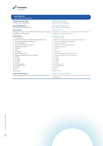 Tanggal dan tempat Rapat:20 Maret 2024 via MSTeamsNomor Risalah Rapat:RRD-036/PHE00000/2024-S0Agenda Rapat:Pemaparan Koreksi Usulan RJPP 2025-2029 dalam Menaikkan NPAT (Net Profit After Tax) Peserta Rapat:1. Direktur Utama2. Direktur Perencanaan Strategis & Pengembangan Bisnis3. Direktur Pengembangan & Produksi4. Direktur Eksplorasi5. Direktur SDM & Penunjang Bisnis6. Corporate Secretary7. VP Legal8. CAE9. VP UBPPM10. Senior Manager PLTP11. Manager Upstream Economic Evaluation12. VP DWI13. VP DTEC14. VP SDRE15. VP P&P16. VP Existing Asset17. VP New Venture18. VP ETEC19. VP IT20.Tim RJPPDireksi yang Tidak Hadir:Direktur Keuangan (Dannif Danusaputro) tidak hadir karena dinasDate and Venue Meeting:March 20, 2024 via MSTeamsMinutes of Meeting Number:RRD-036/PHE00000/2024-S0Meeting Agenda:Presentation of Corrections to the Proposed RJPP 2025-2029 in Increasing NPAT (Net Profit After Tax)Meeting Participants:1. President Director2. Director of Strategic Planning & Business Development3. Director of Development & Production4. Director of Exploration5. Director of HC & Corporate Services6. Corporate Secretary7. VP Legal8. CAE9. VP UBPPM10. Senior ManagerGeothermal Power Plant11. Manager Upstream Economic Evaluation12. VP DWI13. VP DTEC14. VP SDRE15. VP P&P16. VP Existing Asset17. VP New Venture18. VP ETEC19. VP IT20.RJPP TeamDirectors who are Not Present:The Director of Finance (Dannif Danusaputro) was Not Present due to official dutiesRapat Direksi #03Board of Directors Meeting #03Laporan Tahunan %u2022 Annual Report 422HULU ENERGI
