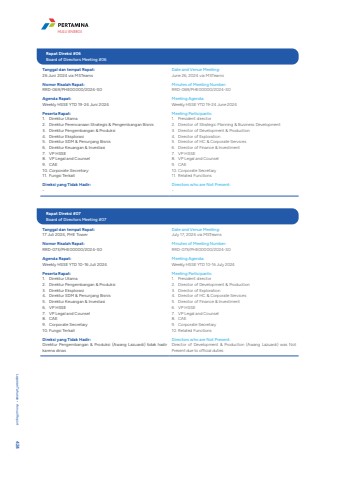 Tanggal dan tempat Rapat:26 Juni 2024 via MSTeamsNomor Risalah Rapat:RRD-069/PHE00000/2024-S0Agenda Rapat:Weekly HSSE YTD 19-24 Juni 2024 Peserta Rapat:1. Direktur Utama2. Direktur Perencanaan Strategis & Pengembangan Bisnis3. Direktur Pengembangan & Produksi4. Direktur Eksplorasi5. Direktur SDM & Penunjang Bisnis6. Direktur Keuangan & Investasi7. VP HSSE8. VP Legal and Counsel9. CAE10. Corporate Secretary11. Fungsi TerkaitDireksi yang Tidak Hadir:-Date and Venue Meeting:June 26, 2024 via MSTeamsMinutes of Meeting Number:RRD-069/PHE00000/2024-S0Meeting Agenda:Weekly HSSE YTD 19-24 June 2024Meeting Participants:1. President director2. Director of Strategic Planning & Business Development3. Director of Development & Production4. Director of Exploration5. Director of HC & Corporate Services6. Director of Finance & Investment7. VP HSSE8. VP Legal and Counsel9. CAE10. Corporate Secretary11. Related FunctionsDirectors who are Not Present:-Tanggal dan tempat Rapat:17 Juli 2024, PHE TowerNomor Risalah Rapat:RRD-073/PHE00000/2024-S0Agenda Rapat:Weekly HSSE YTD 10-16 Juli 2024 Peserta Rapat:1. Direktur Utama2. Direktur Pengembangan & Produksi3. Direktur Eksplorasi4. Direktur SDM & Penunjang Bisnis5. Direktur Keuangan & Investasi6. VP HSSE7. VP Legal and Counsel8. CAE9. Corporate Secretary10. Fungsi TerkaitDireksi yang Tidak Hadir:Direktur Pengembangan & Produksi (Awang Lazuardi) tidak hadir karena dinasDate and Venue Meeting:July 17, 2024 via MSTeamsMinutes of Meeting Number:RRD-073/PHE00000/2024-S0Meeting Agenda:Weekly HSSE YTD 10-16 July 2024Meeting Participants:1. President director2. Director of Development & Production3. Director of Exploration4. Director of HC & Corporate Services5. Director of Finance & Investment6. VP HSSE7. VP Legal and Counsel8. CAE9. Corporate Secretary10. Related FunctionsDirectors who are Not Present:Director of Development & Production (Awang Lazuardi) was Not Present due to official dutiesRapat Direksi #06Board of Directors Meeting #06Rapat Direksi #07Board of Directors Meeting #07Laporan Tahunan %u2022 Annual Report 424HULU ENERGI