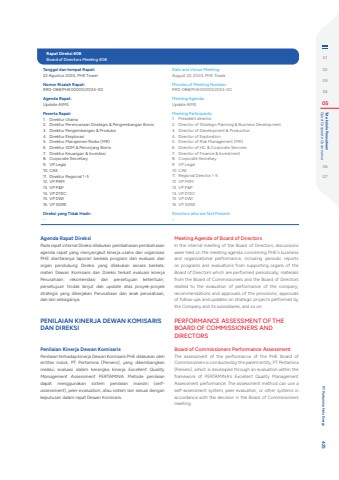 Tanggal dan tempat Rapat:22 Agustus 2024, PHE TowerNomor Risalah Rapat:RRD-088/PHE00000/2024-S0Agenda Rapat:Update AIMS Peserta Rapat:1. Direktur Utama2. Direktur Perencanaan Strategis & Pengembangan Bisnis3. Direktur Pengembangan & Produksi4. Direktur Eksplorasi5. Direktur Manajemen Risiko (MR)6. Direktur SDM & Penunjang Bisnis7. Direktur Keuangan & Investasi8. Corporate Secretary9. VP Legal10. CAE11. Direktur Regional 1-512. VP PRM13. VP P&P14. VP DTEC15. VP DWI16. VP SDREDireksi yang Tidak Hadir:-Date and Venue Meeting:August 22, 2024, PHE TowerMinutes of Meeting Number:RRD-088/PHE00000/2024-S0Meeting Agenda:Update AIMSMeeting Participants:1. President director2. Director of Strategic Planning & Business Development3. Director of Development & Production4. Director of Exploration5. Director of Risk Management (MR)6. Director of HC & Corporate Services7. Director of Finance & Investment8. Corporate Secretary9. VP Legal10. CAE11. Regional Director 1-512. VP PRM13. VP P&P14. VP DTEC15. VP DWI16. VP SDREDirectors who are Not Present:-Rapat Direksi #08Board of Directors Meeting #08Agenda Rapat DireksiPada rapat internal Direksi dilakukan pembahasan pembahasan agenda rapat yang menyangkut kinerja usaha dan organisasi PHE diantaranya laporan berkala program dan evaluasi dari organ pendukung Direksi yang dilakukan secara berkala; materi Dewan Komisaris dan Direksi terkait evaluasi kinerja Perusahaan; rekomendasi dan persetujuan ketentuan; persetujuan tindak lanjut dan update atas proyek-proyek strategis yang dikerjakan Perusahaan dan anak perusahaan, dan lain sebagainya.PENILAIAN KINERJA DEWAN KOMISARIS DAN DIREKSIPenilaian Kinerja Dewan KomisarisPenilaian terhadap kinerja Dewan Komisaris PHE dilakukan oleh entitas induk, PT Pertamina (Persero), yang dikembangkan melalui evaluasi dalam kerangka kinerja Excellent Quality Management Assessment PERTAMINA. Metode penilaian dapat menggunakan sistem penilaian mandiri (selfassessment), peer evaluation, atau sistem lain sesuai dengan keputusan dalam rapat Dewan Komisaris.Meeting Agenda of Board of Directors In the internal meeting of the Board of Directors, discussions were held on the meeting agenda concerning PHE's business and organizational performance, including periodic reports on programs and evaluations from supporting organs of the Board of Directors which are performed periodically; materials from the Board of Commissioners and the Board of Directors related to the evaluation of performance of the company; recommendations and approvals of the provisions; approvals of follow-ups and updates on strategic projects performed by the Company and its subsidiaries, and so on.PERFORMANCE ASSESSMENT OF THE BOARD OF COMMISSIONERS AND DIRECTORSBoard of Commissioners Performance AssessmentThe assessment of the performance of the PHE Board of Commissioners is conducted by the parent entity, PT Pertamina (Persero), which is developed through an evaluation within the framework of PERTAMINA's Excellent Quality Management Assessment performance. The assessment method can use a self-assessment system, peer evaluation, or other systems in accordance with the decision in the Board of Commissioners meeting.0102030405 Good Corporate Governance Tata kelola Perusahaan0607 PT Pertamina Hulu Energi 425