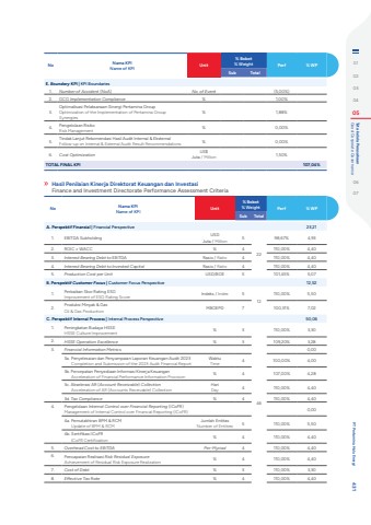 No Nama KPIName of KPI Unit% Bobot% Weight Perf % WPSub TotalA. Perspektif Finansial | Financial Perspective 23,211. EBITDA Subholding USD Juta / Million 52298,67% 4,932. ROIC %u2265 WACC % 4 110,00% 4,403. Interest Bearing Debt to EBITDA Rasio / Ratio 4 110,00% 4,404. Interest Bearing Debt to Invested Capital Rasio / Ratio 4 110,00% 4,405. Production Cost per Unit USD/BOE 5 101,45% 5,07B. Perspektif Customer Focus | Customer Focus Perspective 12,521. Perbaikan Skor Rating ESGImprovement of ESG Rating Score Indeks / Index 512110,00% 5,502. Produksi Minyak & GasOil & Gas Production MBOEPD 7 100,31% 7,02C. Perspektif Internal Process | Internal Process Perspective 50,061. Peningkatan Budaya HSSEHSSE Culture Improvement % 346110,00% 3,302. HSSE Operation Excellence % 3 109,20% 3,283. Financial Information Metrics 0,003a. Penyelesaian dan Penyampaian Laporan Keuangan Audit 2023Completion and Submission of the 2023 Audit Financial ReportWaktuTime 4 100,00% 4,003b. Percepatan Penyediaan Informasi Kinerja KeuanganAcceleration of Financial Performance Information Provision % 4 107,00% 4,283c. Akselerasi AR (Account Receivable) CollectionAcceleration of AR (Accounts Receivable) CollectionHariDay 4 110,00% 4,403d. Tax Compliance % 4 110,00% 4,404. Pengelolaan Internal Control over Financial Reporting (ICoFR)Management of Internal Control over Financial Reporting (ICoFR) 0,004a. Pemutakhiran BPM & RCMUpdate of BPM & RCMJumlah EntitasNumber of Entities 5 110,00% 5,504b. Sertifikasi ICoFRICoFR Certification % 4 110,00% 4,405. Overhead Cost to EBITDA Per-Myriad 4 110,00% 4,406. Pencapaian Realisasi Risk Residual ExposureAchievement of Residual Risk Exposure Realization % 4 110,00% 4,407. Cost of Debt % 3 110,00% 3,308. Effective Tax Rate % 4 110,00% 4,40Hasil Penilaian Kinerja Direktorat Keuangan dan Investasi Finance and Investment Directorate Performance Assessment CriteriaNo Nama KPIName of KPI Unit% Bobot% Weight Perf % WPSub TotalE. Boundary KPI | KPI Boundaries1. Number of Accident (NoA) No. of Event (5,00%)2. GCG Implementation Compliance % 1,00%3.Optimalisasi Pelaksanaan Sinergi Pertamina GroupOptimization of the Implementation of Pertamina Group Synergies% 1,88%4. Pengelolaan RisikoRisk Management % 0,00%5. Tindak Lanjut Rekomendasi Hasil Audit Internal & Eksternal Follow-up on Internal & External Audit Result Recommendations % 0,00%6. Cost Optimization US$ Juta / Million 1,50%TOTAL FINAL KPI 107,04%0102030405 Good Corporate Governance Tata kelola Perusahaan0607 PT Pertamina Hulu Energi 431