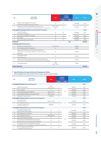 No Nama KPIName of KPI Unit% Bobot% Weight Perf % WPSub TotalA. Perspektif Finansial | Financial Perspective 23,211. EBITDA Subholding USD Juta / Million 52298,67% 4,932. ROIC %u2265 WACC % 4 110,00% 4,403. Interest Bearing Debt to EBITDA Rasio / Ratio 4 110,00% 4,404. Interest Bearing Debt to Invested Capital Rasio / Ratio 4 110,00% 4,405. Production Cost per Unit USD/BOE 5 101,45% 5,07B. Perspektif Customer Focus | Customer Focus Perspective 12,521. Skor Rating ESGESG Rating Score Indeks / Index 512110,00% 5,502. Produksi Minyak & GasOil & Gas Production MBOEPD 7 100,31% 7,02C. Perspektif Internal Process | Internal Process Perspective 57,181. Peningkatan Budaya HSSEHSSE Culture Improvement % 352110,000% 3,302. HSSE Operation Excellence % 3 109,20% 3,283. User Satisfaction Index Skala (Likert) 3 110,00% 3,304. Rasio Total Capacity at Risk % 4 110,00% 4,405. Pengembangan Strategi Risiko PerusahaanDevelopment of the Company's Risk Strategy % 6 110,00% 6,606. Pengelolaan Komite Tata Kelola TerintegrasiManagement of the Integrated Governance Committee % 4 110,00% 4,407. Skor Peringkat Komposit RisikoComposite Risk Rating Score % 3 110,00% 3,30Hasil Penilaian Kinerja Direktorat Manajemen RisikoRisk Management Directorate Performance Assessment CriteriaNo Nama KPIName of KPI Unit% Bobot% Weight Perf % WPSub Total8. Utilisasi Sistem Digital ProcurementUtilization of Digital Procurement System % 4 109,70% 4,399. Pelaksanaan Sinergi Pengadaan barang dan JasaImplementation of Synergy in Goods and Services ProcurementJuta / MillionUSD 2 110,00% 2,20D. Perspektif Learning & Growth | Learning & Growth Perspective 23,531. Realisasi InvestasiInvestment Realization % 822103,84% 8,312. Key Positions Fulfillment Program % 6 107,10% 6,433. KSI & QMA % 4 109,99% 4,404. Business Initiatives SDM & PB % 4 110,00% 4,40TOTAL KPI 100 107,20%E. Boundary KPI | KPI Boundaries1. Number of Accident (NoA) No. of Event (4,00%)2. GCG Implementation Compliance % 1,00%3.Optimalisasi Pelaksanaan Sinergi Pertamina GroupOptimization of the Implementation of Pertamina Group Synergies% 1,88%4. Pengelolaan RisikoRisk Management % 0,00%5. Tindak Lanjut Rekomendasi Hasil Audit Internal & Eksternal Follow-up on Internal & External Audit Result Recommendations % 0,00%6. Cost Optimization US$ Juta / Million 1,50%TOTAL FINAL KPI 107,58%0102030405 Good Corporate Governance Tata kelola Perusahaan0607 PT Pertamina Hulu Energi 433