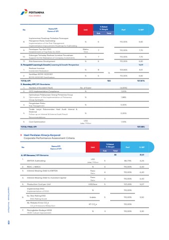 No Nama KPIName of KPI Unit% Bobot% Weight Perf % WPSub Total8.Implementasi Roadmap Perbaikan Penerapan Manajemen Risiko SubholdingImplementation of the Risk Management Implementation Improvement Roadmap for Subholding% 6 110,00% 6,609. Penetapan Top Risk 2025Establishment of Top Risks for 2025WaktuTime 7 110,00% 7,7010. Dukungan Terhadap Realisasi Investasi PerusahaanSupport for the Realization of Company Investments % 7 110,00% 7,7011. Risk Awareness Development % 6 110,00% 6,60D. Perspektif Learning & Growth | Learning & Growth Perspective 14,911. Realisasi InvestasiInvestment Realization % 814103,84% 8,312. Sertifikasi BCMS ISO22301 BCMS ISO22301 Sertification % 6 110,00% 6,60TOTAL KPI 100 107,81%E. Boundary KPI | KPI Boundaries1. Number of Accident (NoA) No. of Event (4,00%)2. GCG Implementation Compliance % 1,00%3.Optimalisasi Pelaksanaan Sinergi Pertamina GroupOptimization of the Implementation of Pertamina Group Synergies% 1,88%4. Pengelolaan RisikoRisk Management % 0,00%5.Tindak Lanjut Rekomendasi Hasil Audit Internal & Eksternal Follow-up on Internal & External Audit Result Recommendations% 0,00%6. Cost Optimization US$ Juta / Million 1,50%TOTAL FINAL KPI 107,58%Hasil Penilaian Kinerja KorporatCorporate Performance Assessment CriteriaNo Nama KPIName of KPI Unit% Bobot% Weight Perf % WPSub TotalA. KPI Bersama / KPI Bersama 30 31,311. EBITDA Subholding USD Juta / Million 5 84,73% 4,242. ROIC %u2265 WACC % 4 110,00% 4,403. Interest Bearing Debt to EBITDA RasioRatio 4 110,00% 4,404. Interest Bearing Debt to Invested Capital RasioRatio 4 110,00% 4,405. Production Cost per Unit USD/boe 5 101,45% 5,076.Implementasi ESGImplementation of ESG %5110,00%5,50 6a. Skor Rating ESGESG Rating Score Indeks 110,00%6b. Reduksi Emisi CO2eCO2e Emissions Reduction KT CO2e 110,00%7. Peningkatan Budaya HSSEHSSE Culture Improvement % 3 110,00% 3,30Laporan Tahunan %u2022 Annual Report 434HULU ENERGI