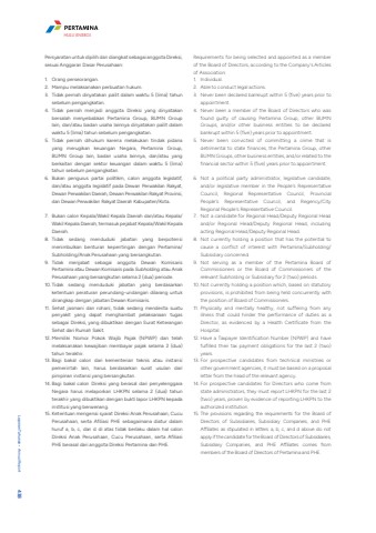 Persyaratan untuk dipilih dan diangkat sebagai anggota Direksi, sesuai Anggaran Dasar Perusahaan:1. Orang perseorangan.2. Mampu melaksanakan perbuatan hukum.3. Tidak pernah dinyatakan pailit dalam waktu 5 (lima) tahun sebelum pengangkatan.4. Tidak pernah menjadi anggota Direksi yang dinyatakan bersalah menyebabkan Pertamina Group, BUMN Group lain, dan/atau badan usaha lainnya dinyatakan pailit dalam waktu 5 (lima) tahun sebelum pengangkatan.5. Tidak pernah dihukum karena melakukan tindak pidana yang merugikan keuangan Negara, Pertamina Group, BUMN Group lain, badan usaha lainnya, dan/atau yang berkaitan dengan sektor keuangan dalam waktu 5 (lima) tahun sebelum pengangkatan.6. Bukan pengurus partai politikm, calon anggota legislatif, dan/atau anggota legislatif pada Dewan Perwakilan Rakyat, Dewan Perwakilan Daerah, Dewan Perwakilan Rakyat Provinsi, dan Dewan Perwakilan Rakyat Daerah Kabupaten/Kota.7. Bukan calon Kepala/Wakil Kepala Daerah dan/atau Kepala/Wakil Kepala Daerah, termasuk pejabat Kepala/Wakil Kepala Daerah.8. Tidak sedang menduduki jabatan yang berpotensi menimbulkan benturan kepentingan dengan Pertamina/Subholding/Anak Perusahaan yang bersangkutan.9. Tidak menjabat sebagai anggota Dewan Komisaris Pertamina atau Dewan Komisaris pada Subholding atau Anak Perusahaan yang bersangkutan selama 2 (dua) periode.10. Tidak sedang menduduki jabatan yang berdasarkan ketentuan peraturan perundang-undangan dilarang untuk dirangkap dengan jabatan Dewan Komisaris.11. Sehat jasmani dan rohani, tidak sedang menderita suatu penyakit yang dapat menghambat pelaksanaan tugas sebagai Direksi, yang dibuktikan dengan Surat Keterangan Sehat dari Rumah Sakit.12. Memiliki Nomor Pokok Wajib Pajak (NPWP) dan telah melaksanakan kewajiban membayar pajak selama 2 (dua) tahun terakhir. 13. Bagi bakal calon dari kementerian teknis atau instansi pemerintah lain, harus berdasarkan surat usulan dari pimpinan instansi yang bersangkutan.14. Bagi bakal calon Direksi yang berasal dari penyelenggara Negara harus melaporkan LHKPN selama 2 (dua) tahun terakhir yang dibuktikan dengan bukti lapor LHKPN kepada institusi yang berwenang.15. Ketentuan mengenai syarat Direksi Anak Perusahaan, Cucu Perusahaan, serta Afiliasi PHE sebagaimana diatur dalam huruf a, b, c, dan d di atas tidak berlaku dalam hal calon Direksi Anak Perusahaan, Cucu Perusahaan, serta Afiliasi PHE berasal dari anggota Direksi Pertamina dan PHE. Requirements for being selected and appointed as a member of the Board of Directors, according to the Company's Articles of Association:1. Individual.2. Able to conduct legal actions.3. Never been declared bankrupt within 5 (five) years prior to appointment.4. Never been a member of the Board of Directors who was found guilty of causing Pertamina Group, other BUMN Groups, and/or other business entities to be declared bankrupt within 5 (five) years prior to appointment.5. Never been convicted of committing a crime that is detrimental to state finances, the Pertamina Group, other BUMN Groups, other business entities, and/or related to the financial sector within 5 (five) years prior to appointment.6. Not a political party administrator, legislative candidate, and/or legislative member in the People's Representative Council, Regional Representative Council, Provincial People's Representative Council, and Regency/City Regional People's Representative Council.7. Not a candidate for Regional Head/Deputy Regional Head and/or Regional Head/Deputy Regional Head, including acting Regional Head/Deputy Regional Head.8. Not currently holding a position that has the potential to cause a conflict of interest with Pertamina/Subholding/Subsidiary concerned.9. Not serving as a member of the Pertamina Board of Commissioners or the Board of Commissioners of the relevant Subholding or Subsidiary for 2 (two) periods.10. Not currently holding a position which, based on statutory provisions, is prohibited from being held concurrently with the position of Board of Commissioners.11. Physically and mentally healthy, not suffering from any illness that could hinder the performance of duties as a Director, as evidenced by a Health Certificate from the Hospital.12. Have a Taxpayer Identification Number (NPWP) and have fulfilled their tax payment obligations for the last 2 (two) years.13. For prospective candidates from technical ministries or other government agencies, it must be based on a proposal letter from the head of the relevant agency.14. For prospective candidates for Directors who come from state administrators, they must report LHKPN for the last 2 (two) years, proven by evidence of reporting LHKPN to the authorized institution.15. The provisions regarding the requirements for the Board of Directors of Subsidiaries, Subsidiary Companies, and PHE Affiliates as stipulated in letters a, b, c, and d above do not apply if the candidate for the Board of Directors of Subsidiaries, Subsidiary Companies, and PHE Affiliates comes from members of the Board of Directors of Pertamina and PHE.Laporan Tahunan %u2022 Annual Report 438HULU ENERGI