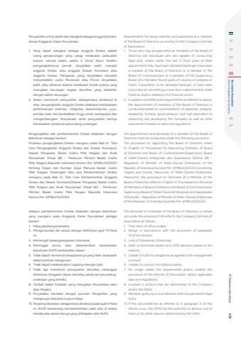 Persyaratan untuk dipilih dan diangkat sebagai anggota Direksi, sesuai Anggaran Dasar Perusahaan:1. Yang dapat diangkat sebagai anggota Direksi adalah orang perseorangan yang cakap melakukan perbuatan hukum, kecuali dalam waktu 5 (lima) tahun terakhir pengangkatannya pernah dinyatakan pailit, menjadi anggota Direksi atau anggota Dewan Komisaris atau anggota Dewan Pengawas yang dinyatakan bersalah menyebabkan suatu Perseroan atau Perum dinyatakan pailit, atau dihukum karena melakukan tindak pidana yang merugikan keuangan negara dan/atau yang berkaitan dengan sektor keuangan. 2. Selain memenuhi persyaratan sebagaimana dimaksud di atas, pengangkatan anggota Direksi dilakukan berdasarkan pertimbangan keahlian, integritas, kepemimpinan, jujur, perilaku baik, dan berdedikasi tinggi untuk memajukan dan mengembangkan Perusahaan serta persyaratan lainnya berdasarkan peraturan perundang-undangan. Pengangkatan dan pemberhentian Direksi dilakukan dengan ketentuan sebagai berikut:Prosedur pengangkatan Direksi mengacu pada Bab IV: Tata Cara Pengangkatan Anggota Direksi dan Dewan Komisaris/Dewan Pengawas Badan Usaha Milik Negara dan Anak Perusahaan (Pasal 38) %u2013 Peraturan Menteri Badan Usaha Milik Negara Republik Indonesia Nomor Per-3/MBU/03/2023 tentang Organ dan Sumber Daya Manusia Badan Usaha Milik Negara. Sedangkan tata cara Pemberhentian Direksi mengacu pada Bab VI: Tata Cara Pemberhentian Anggota Direksi dan Dewan Komisaris/Dewan Pengawas Badan Usaha Milik Negara dan Anak Perusahaan (Pasal 66) - Peraturan Menteri Badan Usaha Milik Negara Republik Indonesia Nomor Per-3/MBU/03/2023. Adapun pemberhentian Direksi dilakukan dengan ketentuan yang mengacu pada Anggaran Dasar Perusahaan sebagai berikut:1. Masa jabatannya berakhir;2. Mengundurkan diri sesuai dengan ketentuan ayat 19 Pasal ini;3. Kehilangan kewarganegaraan Indonesia;4. Meninggal dunia; atau diberhentikan berdasarkan keputusan RUPS berdasarkan alasan;5. Tidak dapat memenuhi kewajibannya yang telah disepakati dalam kontrak manajemen;6. Tidak dapat melaksanakan tugasnya dengan baik;7. Tidak lagi memenuhi persyaratan dan/atau melanggar ketentuan Anggaran Dasar dan/atau peraturan perundangundangan yang berlaku;8. Terlibat dalam tindakan yang merugikan Perusahaan dan/atau Negara;9. Dinyatakan bersalah dengan putusan Pengadilan yang mempunyai kekuatan hukum tetap;10. Terjadinya keadaan sebagaimana dimaksud pada ayat 4 Pasal ini, RUPS berwenang memberhentikan salah satu di antara mereka atau alasan lainnya yang ditetapkan oleh RUPS. Requirements for being selected and appointed as a member of the Board of Directors, according to the Company's Articles of Association:1. Those who may be appointed as members of the Board of Directors are individuals who are capable of conducting legal acts, unless within the last 5 (five) years of their appointment they have been declared bankrupt, have been a member of the Board of Directors or a member of the Board of Commissioners or a member of the Supervisory Board who has been found guilty of causing a Company or Public Corporation to be declared bankrupt, or have been convicted of committing a crime that is detrimental to state finances and/or related to the financial sector.2. In addition to fulfilling the requirements as referred to above, the appointment of members of the Board of Directors is conducted based on considerations of expertise, integrity, leadership, honesty, good behavior, and high dedication to advancing and developing the Company as well as other requirements based on laws and regulations. The appointment and dismissal of a member of the Board of Directors must be conducted under the following provisions:The procedure for appointing the Board of Directors refers to Chapter IV: Procedures for Appointing Members of Board of Directors and Board of Commissioners/Supervisory Board of State-Owned Enterprises and Subsidiaries (Article 38) - Regulation of Minister of State-Owned Enterprises of the Republic of Indonesia Number Per-3/MBU/03/2023 concerning Organs and Human Resources of State-Owned Enterprises. Meanwhile, the procedure for Dismissal of a Member of the Board of Directors refers to Chapter VI: Procedures for Dismissal of Members of Board of Directors and Board of Commissioners/Supervisory Board of State-Owned Enterprises and Subsidiaries (Article 66) - Regulation of Minister of State-Owned Enterprises of the Republic of Indonesia Number Per-3/MBU/03/2023.The dismissal of a member of the Board of Directors is carried out under the provisions that refer to the Company's Articles of Association as follows:1. Their term of office ended;2. Resign in accordance with the provisions of paragraph 19 of this Article;3. Loss of Indonesian citizenship;4. Died; or dismissed based on a GMS decision based on the reasons;5. Unable to fulfill its obligations as agreed in the management contract;6. Unable to conduct his duties properly;7. No longer meets the requirements and/or violates the provisions of the Articles of Association and/or applicable laws and regulations;8. Involved in actions that are detrimental to the Company and/or the State;9. Declared guilty by a court decision that has permanent legal force;10. If the circumstances as referred to in paragraph 4 of this Article occur, the GMS has the authority to dismiss one of them or for other reasons determined by the GMS.0102030405 Good Corporate Governance Tata kelola Perusahaan0607 PT Pertamina Hulu Energi 439