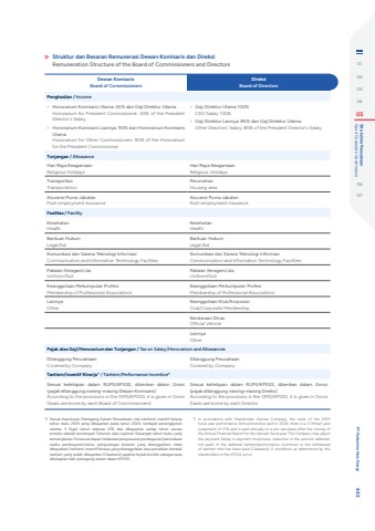 Struktur dan Besaran Remunerasi Dewan Komisaris dan DireksiRemuneration Structure of the Board of Commissioners and DirectorsDewan KomisarisBoard of CommissionersDireksiBoard of DirectorsPenghasilan / Income%u2022 Honorarium Komisaris Utama: 45% dari Gaji Direktur UtamaHonorarium for President Commissioner: 45% of the President Director's Salary%u2022 Honorarium Komisaris Lainnya: 90% dari Honorarium Komisaris UtamaHonorarium for Other Commissioners: 90% of the Honorarium for the President Commissioner%u2022 Gaji Direktur Utama 100%CEO Salary 100%%u2022 Gaji Direktur Lainnya: 85% dari Gaji Direktur UtamaOther Directors' Salary: 85% of the President Director's SalaryTunjangan / AllowanceHari Raya KeagamaanReligious HolidaysHari Raya KeagamaanReligious HolidaysTransportasiTransportationPerumahanHousing areaAsuransi Purna JabatanPost-employment insuranceAsuransi Purna JabatanPost-employment insuranceFasilitas / FacilityKesehatanHealthKesehatanHealthBantuan HukumLegal AidBantuan HukumLegal AidKomunikasi dan Sarana Teknologi InformasiCommunication and Information Technology FacilitiesKomunikasi dan Sarana Teknologi InformasiCommunication and Information Technology FacilitiesPakaian Seragam/JasUniform/SuitPakaian Seragam/JasUniform/SuitKeanggotaan Perkumpulan ProfesiMembership of Professional AssociationsKeanggotaan Perkumpulan ProfesiMembership of Professional AssociationsLainnyaOtherKeanggotaan Klub/KorporasiClub/Corporate MembershipKendaraan DinasOfficial VehicleLainnyaOtherPajak atas Gaji/Honorarium dan Tunjangan / Tax on Salary/Honorarium and AllowancesDitanggung PerusahaanCovered by CompanyDitanggung PerusahaanCovered by CompanyTantiem/Insentif Kinerja* / Tantiem/Performance Incentive*Sesuai ketetapan dalam RUPS/KPSSS, diberikan dalam Gross(pajak ditanggung masing-masing Dewan Komisaris)According to the provisions in the GMS/KPSSS, it is given in Gross (taxes are borne by each Board of Commissioners)Sesuai ketetapan dalam RUPS/KPSSS, diberikan dalam Gross(pajak ditanggung masing-masing Direksi)According to the provisions in the GMS/KPSSS, it is given in Gross (taxes are borne by each Director*) Sesuai Keputusan Pemegang Saham Perusahaan, nilai tantiem/ insentif kinerja tahun buku 2023 yang dibayarkan pada tahun 2024, terdapat penangguhan selama 3 (tiga) tahun sebesar 21% dan dibayarkan setiap tahun secara prorata setelah penutupan Tahunan atas Laporan Keuangan tahun buku yang bersangkutan. Perseroan dapat melakukan penyesuaian pembayaran (penundaan waktu pembayaran/malus, pengurangan besaran yang ditangguhkan, tidak dibayarkan) tantiem/ insentif kinerja yang ditangguhkan atau penarikan kembali tantiem yang sudah dibayarkan (Clawback) apabila terjadi kondisi sebagaimana ditetapkan oleh pemegang saham dalam KPSSS.*) In accordance with Shareholder Decree Company, the value of the 2023 fiscal year performance bonus/incentive paid in 2024, there is a 3 (three) year suspension of 21% and is paid annually on a pro rata basis after the closing of the Annual Financial Report for the relevant fiscal year. The Company may adjust the payment (delay in payment time/malus, reduction in the amount deferred, not paid) of the deferred tantiem/performance incentives or the withdrawal of tantiem that has been paid (Clawback) if conditions as determined by the shareholders in the KPSSS occur.0102030405 Good Corporate Governance Tata kelola Perusahaan0607 PT Pertamina Hulu Energi 443