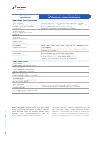 Nama dan JabatanName and PositionRangkap Jabatan di Perusahaan Lain/Lembaga/InstansiDual Positions in Other Companies/Institutions/AgenciesDewan Komisaris / Board of CommissionersRinaldi Firmansyah (Komisaris Utama/Komisaris Independen | President Commisioner/Independent Commisioner)%u2022 Komisaris Independen PT Indonesia Infrastructure Finance (2018-sekarang).Independent Commissioner of PT Indonesia Infrastructure Finance (2018-present).%u2022 Komisaris Independen PT Bluebird Tbk (2013-sekarang).Independent Commissioner of PT Bluebird Tbk (2013-present).Tumpak Simanjuntak (Komisaris Independen | Komisaris Independen)-Tutuka Ariadji (Komisaris | Commisioner) -Nanang Untung (Komisaris | Commisioner) -Abdi Mustakim (Komisaris | Commisioner)%u2022 Asisten Deputi Bidang Industri Energi, Minyak dan Gas, Kementerian BUMN (2020-sekarang).Assistant Deputy for Energy, Oil and Gas Industry, Ministry of State-Owned Enterprises (2020-present.Paiman Raharjo (Komisaris | Commisioner)%u2022 Rektor University of Jakarta International (2022-sekarang)Rector of University of Jakarta International (2022-present)%u2022 Dosen Pendidikan Pancasila - FISIP UPDM (B) (1999-sekarang)Lecturer of Pancasila Education - FISIP UPDM (B) (1999-present)Direksi / Board of DirectorsChalid Said Salim (Direktur Utama | Chief Executive Officer) -Awang Lazuardi (Direktur Pengembangan dan Produksi | Director of Development & Production)-Muharram J. Panguriseng (Direktur Eksplorasi | Director of Exploration) -Whisnu Bahriansyah (Direktur SDM & Penunjang Bisnis | Director of HC & Corporate Services)-Dannif Danusaputro (Direktur Keuangan & Investasi | Director of Finance & investment)%u2022 Komisaris PT Pertamina Geothermal Energy Tbk (2023-sekarang).Commissioner of PT Pertamina Geothermal Energy Tbk (2023-present).Mery Luciawaty (Direktur Manajemen Risiko | Director of Risk Management) -Berikut disampaikan hubungan afiliasi yang terjadi akibat adanya hubungan keluarga maupun hubungan usaha antara Dewan Komisaris, Direksi, PT Pertamina (Persero) selaku Pemegang Saham Utama/Pengendali/Entitas Induk, dan Pemerintah Indonesia selaku Entitas Pemilik Akhir.The following describes the affiliated relationships that occur due to family relationships or business relationships between the Board of Commissioners, Board of Directors, PT Pertamina (Persero) as the Main/Controlling Shareholder/Holding Entity, and the Government of Indonesia as the Ultimate Owner Entity. Laporan Tahunan %u2022 Annual Report 446HULU ENERGI