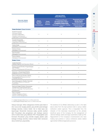 Nama dan JabatanName and PositionHubungan AfiliasiAffiliate RelationshipDewan KomisarisBoard of CommissionersDireksiBoard of DirectorsPT Pertamina (Persero) (Pemegang Saham Utama / Pengendali / Entitas Induk) PT Pertamina (Persero) (Main Shareholder / Controller / Holding Entity)Pemerintah Indonesia (Entitas Pemilik Manfaat Akhir)Government of Indonesia (Ultimate Beneficial Owner Entity)Dewan Komisaris / Dewan KomisarisRinaldi Firmansyah (Komisaris Utama/Komisaris Independen | President Commissioner/Independent Commissioner)%uf0fb %uf0fb %uf0fb %uf0fbTumpak Simanjuntak (Komisaris Independen | Independent Commissioner)%uf0fb %uf0fb %uf0fb %uf0fbTutuka Ariadji (Komisaris | Commissioner) %uf0fb %uf0fb %uf0fb %uf0fbNanang Untung (Komisaris | Commissioner) %uf0fb %uf0fb %uf0fb %uf0fbAbdi Mustakim (Komisaris | Commissioner) %uf0fb %uf0fb %uf0fb %uf0fcPaiman Raharjo (Komisaris | Commissioner) %uf0fb %uf0fb %uf0fb %uf0fbDireksi / DireksiChalid Said Salim (Direktur Utama | Chief Executive Officer) %uf0fb %uf0fb %uf0fb %uf0fbAwang Lazuardi (Direktur Pengembangan dan Produksi | Director of Development & Production)%uf0fb %uf0fb %uf0fb %uf0fbMuharram J. Panguriseng (Direktur Eksploras | Director of Exploration) %uf0fb %uf0fb %uf0fb %uf0fbWhisnu Bahriansyah (Direktur SDM & Penunjang Bisnis | Director of HC & Corporate Services)%uf0fb %uf0fb %uf0fb %uf0fbDannif Danusaputro (Direktur Keuangan & Investasi | Director of Finance & investment)%uf0fb %uf0fb %uf0fb %uf0fbRachmat Hidajat (Direktur Perencanaan Strategis dan Pengembangan Bisnis | Director of Strategic Planning & Business Development)%uf0fb %uf0fb %uf0fb %uf0fbMery Luciawaty (Direktur Manajemen Risiko | Director of Risk Management)%uf0fb %uf0fb %uf0fb %uf0fb%uf0fc = terdapat hubungan afiliasi | there is an affiliate relationship %uf0fb = tidak terdapat hubungan afiliasi | there is no affiliate relationshipAdanya hubungan afiliasi sebagaimana terlihat pada tabel di atas muncul dari rangkap jabatan yang dimiliki pada berbagai lembaga dan/atau instansi terkait. Hal ini tidak lepas dari kepentingan Pemerintah Indonesia selaku pemilik manfaat akhir Perusahaan atas pengelolaan aset strategis nasional serta investasi besar yang dilakukan PHE. Pengangkatan para Komisaris Perusahaan yang memiliki rangkap jabatan pada berbagai lembaga dan/atau instansi terkait telah memenuhi seluruh ketentuan yang berlaku.The existence of an affiliate relationship as seen in the table above arises from the dual positions held in various related institutions and/or agencies. This is inseparable from the interests of the Indonesian Government as the ultimate beneficial owner of the Company for the management of national strategic assets and large investments made by PHE. Pappointment of the Company's Commissioners who have holding dual positions in various institutions and/or related agencieshas fulfilled all applicable provisions.0102030405 Good Corporate Governance Tata kelola Perusahaan0607 PT Pertamina Hulu Energi 447