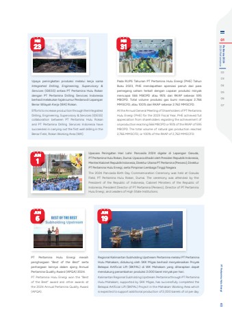 Pada RUPS Tahunan PT Pertamina Hulu Energi (PHE) Tahun Buku 2023, PHE mendapatkan apresiasi penuh dari para pemegang saham terkait dengan capaian produksi minyak mencapai 566 MBOPD atau 95% dari RKAP sebesar 595 MBOPD. Total volume produksi gas bumi mencapai 2.766 MMSCFD, atau 100% dari RKAP sebesar 2.762 MMSCFD.At the Annual General Meeting of Shareholders of PT Pertamina Hulu Energi (PHE) for the 2023 Fiscal Year, PHE achieved full appreciation from shareholders regarding the achievement of oil production reaching 566 MBOPD or 95% of the RKAP of 595 MBOPD. The total volume of natural gas production reached 2,766 MMSCFD, or 100% of the RKAP of 2,762 MMSCFD.MEI23MEI31Upaya peningkatan produksi melalui kerja sama Integrated Drilling, Engineering, Supervisory & Services (IDESS) antara PT Pertamina Hulu Rokan dengan PT Pertamina Drilling Services Indonesia berhasil melakukan tajak sumur Perdana di Lapangan Benar Wilayah Kerja (WK) Rokan.Efforts to increase production through the Integrated Drilling, Engineering, Supervisory & Services (IDESS) collaboration between PT Pertamina Hulu Rokan and PT Pertamina Drilling Services Indonesia have succeeded in carrying out the first well drilling in the Benar Field, Rokan Working Area (WK).Upacara Peringatan Hari Lahir Pancasila 2024 digelar di Lapangan Garuda, PT Pertamina Hulu Rokan, Dumai. Upacara dihadiri oleh Presiden Republik Indonesia, Menteri Kabinet Republik Indonesia, Direktur Utama PT Pertamina (Persero), Direktur PT Pertamina Hulu Energi, serta Pimpinan Lembaga Tinggi Negara.The 2024 Pancasila Birth Day Commemoration Ceremony was held at Garuda Field, PT Pertamina Hulu Rokan, Dumai. The ceremony was attended by the President of the Republic of Indonesia, Cabinet Ministers of the Republic of Indonesia, President Director of PT Pertamina (Persero), Director of PT Pertamina Hulu Energi, and Leaders of High State Institutions.JUN1PT Pertamina Hulu Energi meraih penghargaan %u201cBest of the Best%u201d serta perhargaan lainnya dalam ajang Annual Pertamina Quality Award (APQA) 2024.PT Pertamina Hulu Energi won the %u201cBest of the Best%u201d award and other awards at the 2024 Annual Pertamina Quality Award (APQA).JUN6Regional Kalimantan Subholding Upstream Pertamina melalui PT Pertamina Hulu Mahakam, didukung oleh SKK Migas berhasil menyelesaikan Proyek Bekapai Artificial Lift (BKPAL) di WK Mahakam yang diharapkan dapat mendukung penambahan produksi 2.000 barel minyak per hari.Kalimantan Regional Subholding Upstream Pertamina through PT Pertamina Hulu Mahakam, supported by SKK Migas, has successfully completed the Bekapai Artificial Lift (BKPAL) Project in the Mahakam Working Area which is expected to support additional production of 2,000 barrels of oil per day.JUN1901 2024 Performance Performa 2024020304050607Laporan Tahunan %u2022 Annual Report 42PT Pertamina Hulu Energi 43