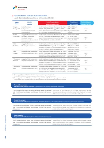 *) Pada tanggal 25 Januari 2024 Abdi Mustakim diangkat menjadi Anggota Komite AuditOn January 25, 2024, Abdi Mustakim was appointed as a Member of the Audit Committee**) Pada tanggal 1 November 2024 Areiyando Makmun diganti oleh Kurnia Sari Dewi sebagai anggota Komite AuditOn November 1, 2024 Areiyando Makmun was replaced by Kurnia Sari Dewi as a member of the Audit CommitteeSusunan Komite Audit per 31 Desember 2024Audit Committee Composition as of December 31, 2024NamaNameJabatanPositionDasar PengangkatanBasis for AppointmentMasa JabatanTerm of OfficePeriode JabatanPeriod of OfficeTumpak SimanjuntakKetua/Komisaris Independen Chairman/Independent CommissionerSurat Keputusan Dewan Komisaris No. Kpts009/DK-PHE/2024-S8 tanggal 3 Juni 2024Board of Commissioners Decree No. Kpts-009/DK-PHE/2024-S8 dated June 3, 202415 Mei 2023 s.d 15 Mei 2026May 15, 2023 to May 15, 2026Ke-22ndRinaldi FirmansyahAnggota/Komisaris Utama/Komisaris IndependenMember/President Commissioner/Independent CommissionerSurat Keputusan Dewan Komisaris No. Kpts009/DK-PHE/2024-S8 tanggal 3 Juni 2024Board of Commissioners Decree No. Kpts-009/DK-PHE/2024-S8 dated June 3, 202424 November 2022 s.d 15 Mei 2026November 24, 2022 to May 15, 2026Ke-22nd*Abdi MustakimAnggota/Komisaris Member/Commissioner Surat Keputusan Dewan Komisaris No. Kpts001/DK/PHE/2024 tanggal 25 Januari 2024Decree of the Board of Commissioners No. Kpts001/DK/PHE/2024 dated January 25, 202425 Januari 2024 s.d 19 September 2026January 25, 2024 to September 19, 2026Ke-11stTjatur PurwadiAnggota/Pihak IndependenMember/Independent PartySurat Keputusan Dewan Komisaris No. Kpts003/DK-PHE/2024-S8 tanggal 1 Februari 2024.Decree of the Board of Commissioners No. Kpts003/DK-PHE/2024-S8 dated February 1, 2024.1 Februari 2024 s.d 1 Februari 2026February 1, 2024 to February 1, 2026Ke-22nd**Areiyando MakmunAnggota/Pihak IndependenMember/Independent PartySurat Keputusan Dewan Komisaris No. Kpts009/DK-PHE/2023-S8 tanggal 12 Oktober 2022.Decree of the Board of Commissioners No. Kpts009/DK-PHE/2023-S8 dated October 12, 2022.24 November 2022 s.d 1 November 2024November 24, 2022 to November 1, 2024Ke-22nd**Kurnia Sari DewiAnggota/Pihak IndependenMember/Independent PartySurat Keputusan Dewan Komisaris No. Kpts-016/DK-PHE/2024-S8 tanggal 1 November 2024.Decree of the Board of Commissioners No. Kpts016/DK-PHE/2024-S8 dated November 1, 2024.1 November 2024 s.d 1 November 2027November 1, 2024 to November 1, 2027Ke-11stProfil Ketua Komite Audit, Tumpak Simanjuntak, dapat dilihat pada bab Profil Perusahaan bagian profil Dewan Komisaris di Laporan Tahunan ini.The profile of the Chairman of the Audit Committee, Tumpak Simanjuntak, can be seen in the Company Profile chapter in the Board of Commissioners profile section of this Annual Report.Profil Anggota Komite Audit, Rinaldi Firmansyah, dapat dilihat pada bab Profil Perusahaan bagian profil Dewan Komisaris di Laporan Tahunan ini.The profile of the Audit Committee Member, Rinaldi Firmansyah, can be seen in the Company Profile chapter in the Board of Commissioners profile section of this Annual Report.Profil Anggota Komite Audit, Abdi Mustakim, dapat dilihat pada bab Profil Perusahaan bagian profil Dewan Komisaris di Laporan Tahunan ini.The profile of the Audit Committee Member, Abdi Mustakim, can be seen in the Company Profile chapter in the Board of Commissioners profile section of this Annual Report.Rinaldi FirmansyahAnggota Komite Audit/Komisaris Utama/Komisaris Independen | Member of Audit Committee/President Commissioner/Independent CommissionerAbdi MustakimAnggota Komite Audit/Komisaris | Member of Audit Committee/CommissionerTumpak SimanjuntakKetua Komite Audit/Komisaris Independen | Chairperson of Audit Committee/Independent CommissionerLaporan Tahunan %u2022 Annual Report 450HULU ENERGI