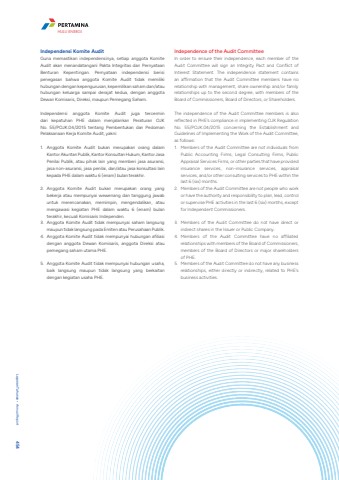 Independensi Komite AuditGuna memastikan independensinya, setiap anggota Komite Audit akan menandatangani Pakta Integritas dan Pernyataan Benturan Kepentingan. Pernyataan independensi berisi penegasan bahwa anggota Komite Audit tidak memiliki hubungan dengan kepengurusan, kepemilikan saham dan/atau hubungan keluarga sampai derajat kedua, dengan anggota Dewan Komisaris, Direksi, maupun Pemegang Saham.Independensi anggota Komite Audit juga tercermin dari kepatuhan PHE dalam menjalankan Peraturan OJK No. 55/POJK.04/2015 tentang Pembentukan dan Pedoman Pelaksanaan Kerja Komite Audit, yakni:1. Anggota Komite Audit bukan merupakan orang dalam Kantor Akuntan Publik, Kantor Konsultan Hukum, Kantor Jasa Penilai Publik, atau pihak lain yang memberi jasa asuransi, jasa non-asuransi, jasa penilai, dan/atau jasa konsultasi lain kepada PHE dalam waktu 6 (enam) bulan terakhir.2. Anggota Komite Audit bukan merupakan orang yang bekerja atau mempunyai wewenang dan tanggung jawab untuk merencanakan, memimpin, mengendalikan, atau mengawasi kegiatan PHE dalam waktu 6 (enam) bulan terakhir, kecuali Komisaris Independen.3. Anggota Komite Audit tidak mempunyai saham langsung maupun tidak langsung pada Emiten atau Perusahaan Publik.4. Anggota Komite Audit tidak mempunyai hubungan afiliasi dengan anggota Dewan Komisaris, anggota Direksi atau pemegang saham utama PHE.5. Anggota Komite Audit tidak mempunyai hubungan usaha, baik langsung maupun tidak langsung yang berkaitan dengan kegiatan usaha PHE.Independence of the Audit CommitteeIn order to ensure their independence, each member of the Audit Committee will sign an Integrity Pact and Conflict of Interest Statement. The independence statement contains an affirmation that the Audit Committee members have no relationship with management, share ownership and/or family relationships up to the second degree, with members of the Board of Commissioners, Board of Directors, or Shareholders.The independence of the Audit Committee members is also reflected in PHE's compliance in implementing OJK Regulation No. 55/POJK.04/2015 concerning the Establishment and Guidelines of Implementing the Work of the Audit Committee, as follows:1. Members of the Audit Committee are not individuals from Public Accounting Firms, Legal Consulting Firms, Public Appraisal Services Firms, or other parties that have provided insurance services, non-insurance services, appraisal services, and/or other consulting services to PHE within the last 6 (six) months.2. Members of the Audit Committee are not people who work or have the authority and responsibility to plan, lead, control or supervise PHE activities in the last 6 (six) months, except for Independent Commissioners.3. Members of the Audit Committee do not have direct or indirect shares in the Issuer or Public Company.4. Members of the Audit Committee have no affiliated relationships with members of the Board of Commissioners, members of the Board of Directors or major shareholders of PHE.5. Members of the Audit Committee do not have any business relationships, either directly or indirectly, related to PHE's business activities.Laporan Tahunan %u2022 Annual Report 454HULU ENERGI