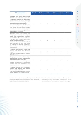 Kriteria Independensi Independence CriteriaTumpak SimanjuntakRinaldi FirmansyahAbdiMustakimTjatur PurwadiAreiyando MakmunKurniaSari DewiMerupakan orang dalam Kantor Akuntan Publik, Kantor Konsultan Hukum, Kantor Jasa Penilai Publik, atau pihak lain yang memberi jasa asuransi, jasa non-asuransi, jasa penilai, dan/atau jasa konsultasi lain kepada PHE dalam waktu 6 (enam) bulan terakhir.Is a person in a Public Accounting Firm, Legal Consultant Firm, Public Appraisal Services Firm, or other party that provides insurance services, non-insurance services, appraisal services, and/or other consulting services to PHE in the last 6 (six) months.%uf0fb %uf0fb %uf0fb %uf0fb %uf0fb %uf0fbMerupakan orang yang bekerja atau mempunyai wewenang dan tanggung jawab untuk merencanakan, memimpin, mengendalikan, atau mengawasi kegiatan PHE dalam waktu 6 (enam) bulan terakhir, kecuali Komisaris Independen.Is a person who works or has the authority and responsibility to plan, lead, control, or supervise PHE activities in the last 6 (six) months, except for Independent Commissioners.%uf0fb %uf0fb %uf0fb %uf0fb %uf0fb %uf0fbMempunyai saham langsung maupun tidak langsung pada Emiten atau Perusahaan Publik.Have direct or indirect shares in Issuers or Public Companies.%uf0fb %uf0fb %uf0fb %uf0fb %uf0fb %uf0fbMempunyai hubungan afiliasi dengan anggota Dewan Komisaris, anggota Direksi atau pemegang saham utama PHE.Having an affiliated relationship with members of the Board of Commissioners, members of the Board of Directors or major shareholders of PHE.%uf0fb %uf0fb %uf0fb %uf0fb %uf0fb %uf0fbMempunyai hubungan usaha, baik langsung maupun tidak langsung yang berkaitan dengan kegiatan usaha PHE.Have business relationships, both direct and indirect, related to PHE business activities.%uf0fb %uf0fb %uf0fb %uf0fb %uf0fb %uf0fbPernyataan independensi Tumpak Simanjuntak dan Rinaldi Firmansyah sebagai Komisaris Independen dapat dilihat pada bagian %u201cDewan Komisaris%u201d dalam bab ini.The independence statement of Tumpak Simanjuntak and Rinaldi Firmansyah as Independent Commissioners can be seen in the %u201cBoard of Commissioners%u201d section in this chapter.0102030405 Good Corporate Governance Tata kelola Perusahaan0607 PT Pertamina Hulu Energi 455