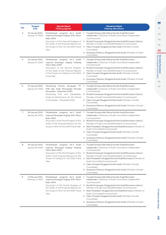 No. TanggalDateAgenda RapatMeeting AgendaKehadiran RapatMeeting Attendance4. 19 Januari 2024January 19, 2024Pembahasan progress ke-2 Audit Laporan Keuangan lingkup SHU Tahun Buku 2023.Discussion of the Second Progress of the Audit of the Financial Reports for the Scope of SHU for the 2023 Fiscal Year.1. Tumpak Simanjuntak (Ketua Komite Audit/Komisaris Independen | Chairman of Audit Committee | Independent Commissioner)2. Rinaldi Firmansyah (Anggota Komite Audit/Komisaris Utama | Member of Audit Committee/President Commissioner)3. Tjatur Purwadi (Anggota Komite Audit | Member of Audit Committee)4. Areiyando Makmun (Anggota Komite Audit | Member of Audit Committee)5. 23 Januari 2024January 23, 2024Pembahasan progress ke-2 Audit Laporan Keuangan lingkup HoldingTahun Buku 2023.Discussion of the Second Progress of the Audit of the Financial Reports of the Scope of Holding for the 2023 Fiscal Year.1. Tumpak Simanjuntak (Ketua Komite Audit/Komisaris Independen | Chairman of Audit Committee | Independent Commissioner)2. Rinaldi Firmansyah (Anggota Komite Audit/Komisaris Utama | Member of Audit Committee/President Commissioner)3. Tjatur Purwadi (Anggota Komite Audit | Member of Audit Committee)4. Areiyando Makmun (Anggota Komite Audit | Member of Audit Committee)6. 23 Januari 2024January 23, 2024Monitoring Kinerja Keuangan PT PHE dan Anak Perusahaan Periode November - Desember 2023.Monitoring PHE and Subsidiaries Financial Performance for the Period of November - December 2023.1. Tumpak Simanjuntak (Ketua Komite Audit/Komisaris Independen | Chairman of Audit Committee | Independent Commissioner)2. Rinaldi Firmansyah (Anggota Komite Audit/Komisaris Utama | Member of Audit Committee/President Commissioner)3. Tjatur Purwadi (Anggota Komite Audit | Member of Audit Committee)4. Areiyando Makmun (Anggota Komite Audit | Member of Audit Committee)7. 26 Januari 2024January 26, 2024Pembahasan progress ke-3 Audit Laporan Keuangan lingkup SHU Tahun Buku 2023.Discussion of the Third Progress of the Audit of the Financial Reports for the Scope of SHU for the 2023 Fiscal Year.1. Tumpak Simanjuntak (Ketua Komite Audit/Komisaris Independen | Chairman of Audit Committee | Independent Commissioner)2. Rinaldi Firmansyah (Anggota Komite Audit/Komisaris Utama | Member of Audit Committee/President Commissioner)3. Abdi Musatakim (Anggota Komite Audit/Komisaris | Member of Audit Committee/Commissioner)4. Tjatur Purwadi (Anggota Komite Audit | Member of Audit Committee)5. Areiyando Makmun (Anggota Komite Audit | Member of Audit Committee)8. 29 Januari 2024January 29, 2024Pembahasan progress ke-3 Audit Laporan Keuangan lingkup HoldingTahun Buku 2023.Discussion of the Third Progress of the Audit of the Financial Reports for the Scope of Holding for the 2023 Fiscal Year.1. Tumpak Simanjuntak (Ketua Komite Audit/Komisaris Independen | Chairman of Audit Committee | Independent Commissioner)2. Rinaldi Firmansyah (Anggota Komite Audit/Komisaris Utama | Member of Audit Committee/President Commissioner)3. Abdi Musatakim (Anggota Komite Audit/Komisaris | Member of Audit Committee/Commissioner)4. Tjatur Purwadi (Anggota Komite Audit | Member of Audit Committee)5. Areiyando Makmun (Anggota Komite Audit | Member of Audit Committee)9. 2 Februari 2024February 2, 2024Pembahasan progress ke-4 Audit Laporan Keuangan lingkup SHU Tahun Buku 2023.Discussion of the Fourth Progress of the Audit of the Financial Reports for the Scope of SHU for the 2023 Fiscal Year.1. Tumpak Simanjuntak (Ketua Komite Audit/Komisaris Independen | Chairman of Audit Committee | Independent Commissioner)2. Rinaldi Firmansyah (Anggota Komite Audit/Komisaris Utama | Member of Audit Committee/President Commissioner)3. Abdi Musatakim (Anggota Komite Audit/Komisaris | Member of Audit Committee/Commissioner)4. Tjatur Purwadi (Anggota Komite Audit | Member of Audit Committee)5. Areiyando Makmun (Anggota Komite Audit | Member of Audit Committee)0102030405 Good Corporate Governance Tata kelola Perusahaan0607 PT Pertamina Hulu Energi 459