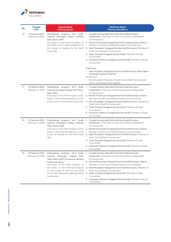 No. TanggalDateAgenda RapatMeeting AgendaKehadiran RapatMeeting Attendance10 5 Februari 2024February 5, 2024Pembahasan progress ke-4 Audit Laporan Keuangan lingkup HoldingTahun Buku 2023.Discussion of the Fourth Progress of the Audit of the Financial Reports for the Scope of Holding for the 2023 Fiscal Year.1. Tumpak Simanjuntak (Ketua Komite Audit/Komisaris Independen | Chairman of Audit Committee | Independent Commissioner)2. Rinaldi Firmansyah (Anggota Komite Audit/Komisaris Utama | Member of Audit Committee/President Commissioner)3. Abdi Musatakim (Anggota Komite Audit/Komisaris | Member of Audit Committee/Commissioner)4. Tjatur Purwadi (Anggota Komite Audit | Member of Audit Committee)5. Areiyando Makmun (Anggota Komite Audit | Member of Audit Committee)Tidak hadir:1. Abdi Mustakim (Anggota Komite Audit/Komisaris) dikarenakan menghadiri agenda rapat lainNot Present:1. Abdi Mustakim (Member of Audit Committee/Commissioner) due to attending another agenda11. 12 Februari 2024February 12, 2024Pembahasan progress ke-5 Audit Laporan Keuangan lingkup SHU Tahun Buku 2023.Discussion of the Fifth Progress of the Audit of the Financial Reports for the Scope of SHU for the 2023 Fiscal Year.1. Tumpak Simanjuntak (Ketua Komite Audit/Komisaris Independen | Chairman of Audit Committee | Independent Commissioner)2. Rinaldi Firmansyah (Anggota Komite Audit/Komisaris Utama | Member of Audit Committee/President Commissioner)3. Abdi Musatakim (Anggota Komite Audit/Komisaris | Member of Audit Committee/Commissioner)4. Tjatur Purwadi (Anggota Komite Audit | Member of Audit Committee)5. Areiyando Makmun (Anggota Komite Audit | Member of Audit Committee)12. 13 Februari 2024February 13, 2024Pembahasan progress ke-5 Audit Laporan Keuangan lingkup HoldingTahun Buku 2023.Discussion of the Fifth Progress of the Audit of the Financial Reports for the Scope of Holding for the 2023 Fiscal Year.1. Tumpak Simanjuntak (Ketua Komite Audit/Komisaris Independen | Chairman of Audit Committee | Independent Commissioner)2. Rinaldi Firmansyah (Anggota Komite Audit/Komisaris Utama | Member of Audit Committee/President Commissioner)3. Abdi Musatakim (Anggota Komite Audit/Komisaris | Member of Audit Committee/Commissioner)4. Tjatur Purwadi (Anggota Komite Audit | Member of Audit Committee)5. Areiyando Makmun (Anggota Komite Audit | Member of Audit Committee)13. 19 Februari 2024February 19, 2024Pembahasan progress ke-6 Audit Laporan Keuangan lingkup SHU Tahun Buku 2023 (khususnya tentang Impairment Aset).Discussion of the Sixth Progress of the Audit of the Financial Reports for the Scope of SHU for the 2023 Fiscal Year (especially regarding Asset Impairment).1. Tumpak Simanjuntak (Ketua Komite Audit/Komisaris Independen | Chairman of Audit Committee | Independent Commissioner)2. Rinaldi Firmansyah (Anggota Komite Audit/Komisaris Utama | Member of Audit Committee/President Commissioner)3. Abdi Musatakim (Anggota Komite Audit/Komisaris | Member of Audit Committee/Commissioner)4. Tjatur Purwadi (Anggota Komite Audit | Member of Audit Committee)5. Areiyando Makmun (Anggota Komite Audit | Member of Audit Committee)Laporan Tahunan %u2022 Annual Report 460HULU ENERGI