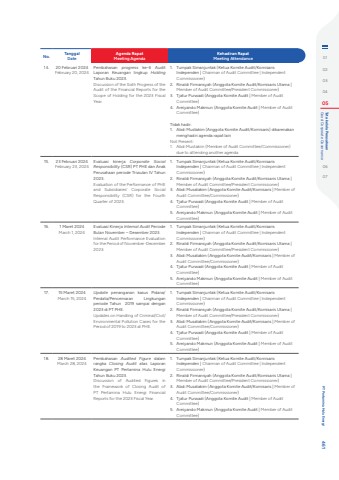No. TanggalDateAgenda RapatMeeting AgendaKehadiran RapatMeeting Attendance14. 20 Februari 2024February 20, 2024Pembahasan progress ke-6 Audit Laporan Keuangan lingkup HoldingTahun Buku 2023.Discussion of the Sixth Progress of the Audit of the Financial Reports for the Scope of Holding for the 2023 Fiscal Year.1. Tumpak Simanjuntak (Ketua Komite Audit/Komisaris Independen | Chairman of Audit Committee | Independent Commissioner)2. Rinaldi Firmansyah (Anggota Komite Audit/Komisaris Utama | Member of Audit Committee/President Commissioner)3. Tjatur Purwadi (Anggota Komite Audit | Member of Audit Committee)4. Areiyando Makmun (Anggota Komite Audit | Member of Audit Committee)Tidak hadir:1. Abdi Mustakim (Anggota Komite Audit/Komisaris) dikarenakan menghadiri agenda rapat lainNot Present:1. Abdi Mustakim (Member of Audit Committee/Commissioner) due to attending another agenda15. 23 Februari 2024February 23, 2024Evaluasi kinerja Corporate Social Responsibility (CSR) PT PHE dan Anak Perusahaan periode Triwulan IV Tahun 2023.Evaluation of the Performance of PHE and Subsidiaries%u2019 Corporate Social Responsibility (CSR) for the Fourth Quarter of 2023.1. Tumpak Simanjuntak (Ketua Komite Audit/Komisaris Independen | Chairman of Audit Committee | Independent Commissioner)2. Rinaldi Firmansyah (Anggota Komite Audit/Komisaris Utama | Member of Audit Committee/President Commissioner)3. Abdi Musatakim (Anggota Komite Audit/Komisaris | Member of Audit Committee/Commissioner)4. Tjatur Purwadi (Anggota Komite Audit | Member of Audit Committee)5. Areiyando Makmun (Anggota Komite Audit | Member of Audit Committee)16. 1 Maret 2024March 1, 2024Evaluasi Kinerja Internal Audit Periode Bulan November %u2013 Desember 2023.Internal Audit Performance Evaluation for the Period of November-December 2023.1. Tumpak Simanjuntak (Ketua Komite Audit/Komisaris Independen | Chairman of Audit Committee | Independent Commissioner)2. Rinaldi Firmansyah (Anggota Komite Audit/Komisaris Utama | Member of Audit Committee/President Commissioner)3. Abdi Musatakim (Anggota Komite Audit/Komisaris | Member of Audit Committee/Commissioner)4. Tjatur Purwadi (Anggota Komite Audit | Member of Audit Committee)5. Areiyando Makmun (Anggota Komite Audit | Member of Audit Committee)17. 15 Maret 2024 March 15, 2024Update penanganan kasus Pidana/ Perdata/Pencemaran Lingkungan periode Tahun 2019 sampai dengan 2023 di PT PHE.Updates on Handling of Criminal/Civil/Environmental Pollution Cases for the Period of 2019 to 2023 at PHE.1. Tumpak Simanjuntak (Ketua Komite Audit/Komisaris Independen | Chairman of Audit Committee | Independent Commissioner)2. Rinaldi Firmansyah (Anggota Komite Audit/Komisaris Utama | Member of Audit Committee/President Commissioner)3. Abdi Musatakim (Anggota Komite Audit/Komisaris | Member of Audit Committee/Commissioner)4. Tjatur Purwadi (Anggota Komite Audit | Member of Audit Committee)5. Areiyando Makmun (Anggota Komite Audit | Member of Audit Committee)18. 28 Maret 2024 March 28, 2024Pembahasan Audited Figure dalam rangka Closing Audit atas Laporan Keuangan PT Pertamina Hulu Energi Tahun Buku 2023.Discussion of Audited Figures in the Framework of Closing Audit of PT Pertamina Hulu Energi Financial Reports for the 2023 Fiscal Year.1. Tumpak Simanjuntak (Ketua Komite Audit/Komisaris Independen | Chairman of Audit Committee | Independent Commissioner)2. Rinaldi Firmansyah (Anggota Komite Audit/Komisaris Utama | Member of Audit Committee/President Commissioner)3. Abdi Musatakim (Anggota Komite Audit/Komisaris | Member of Audit Committee/Commissioner)4. Tjatur Purwadi (Anggota Komite Audit | Member of Audit Committee)5. Areiyando Makmun (Anggota Komite Audit | Member of Audit Committee)0102030405 Good Corporate Governance Tata kelola Perusahaan0607 PT Pertamina Hulu Energi 461