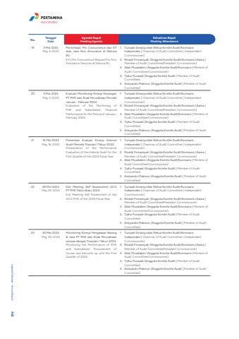 No. TanggalDateAgenda RapatMeeting AgendaKehadiran RapatMeeting Attendance19 3 Mei 2024May 3, 2024Permintaan Pre Concurrence dari EY atas Jasa Non Assurance di Natuna BV.EY's Pre Concurrence Request for Non Assurance Services at Natuna BV.1. Tumpak Simanjuntak (Ketua Komite Audit/Komisaris Independen | Chairman of Audit Committee | Independent Commissioner)2. Rinaldi Firmansyah (Anggota Komite Audit/Komisaris Utama | Member of Audit Committee/President Commissioner)3. Abdi Musatakim (Anggota Komite Audit/Komisaris | Member of Audit Committee/Commissioner)4. Tjatur Purwadi (Anggota Komite Audit | Member of Audit Committee)5. Areiyando Makmun (Anggota Komite Audit | Member of Audit Committee)20 3 Mei 2024May 3, 2024Evaluasi Monitoring Kinerja Keuangan PT PHE dan Anak Perusahaan Periode Januari - Februari 2024.Evaluation of the Monitoring of PHE and Subsidiaries' Financial Performance for the Period of JanuaryFebruary 2024.1. Tumpak Simanjuntak (Ketua Komite Audit/Komisaris Independen | Chairman of Audit Committee | Independent Commissioner)2. Rinaldi Firmansyah (Anggota Komite Audit/Komisaris Utama | Member of Audit Committee/President Commissioner)3. Abdi Musatakim (Anggota Komite Audit/Komisaris | Member of Audit Committee/Commissioner)4. Tjatur Purwadi (Anggota Komite Audit | Member of Audit Committee)5. Areiyando Makmun (Anggota Komite Audit | Member of Audit Committee)21 16 Mei 2024May 16, 2024Presentasi Evaluasi Kinerja Internal Audit Periode Triwulan I Tahun 2024.Presentation of the Performance Evaluation of the Internal Audit for the First Quarter of the 2024 Fiscal Year.1. Tumpak Simanjuntak (Ketua Komite Audit/Komisaris Independen | Chairman of Audit Committee | Independent Commissioner)2. Rinaldi Firmansyah (Anggota Komite Audit/Komisaris Utama | Member of Audit Committee/President Commissioner)3. Abdi Musatakim (Anggota Komite Audit/Komisaris | Member of Audit Committee/Commissioner)4. Tjatur Purwadi (Anggota Komite Audit | Member of Audit Committee)5. Areiyando Makmun (Anggota Komite Audit | Member of Audit Committee)22 29 Mei 2024May 29, 2024Exit Meeting Self Assessment GCG PT PHE Tahun Buku 2023.Exit Meeting Self Assessment of the GCG PHE of the 2023 Fiscal Year.1. Tumpak Simanjuntak (Ketua Komite Audit/Komisaris Independen | Chairman of Audit Committee | Independent Commissioner)2. Rinaldi Firmansyah (Anggota Komite Audit/Komisaris Utama | Member of Audit Committee/President Commissioner)3. Abdi Musatakim (Anggota Komite Audit/Komisaris | Member of Audit Committee/Commissioner)4. Tjatur Purwadi (Anggota Komite Audit | Member of Audit Committee)5. Areiyando Makmun (Anggota Komite Audit | Member of Audit Committee)23 30 Mei 2024May 30, 2024Monitoring Kinerja Pengadaan Barang & Jasa PT PHE dan Anak Perusahaan sampai dengan Triwulan I Tahun 2024.Monitoring the Performance of PHE and Subsidiaries' Procurement of Goods and Services up until the First Quarter of 2024.1. Tumpak Simanjuntak (Ketua Komite Audit/Komisaris Independen | Chairman of Audit Committee | Independent Commissioner)2. Rinaldi Firmansyah (Anggota Komite Audit/Komisaris Utama | Member of Audit Committee/President Commissioner)3. Abdi Musatakim (Anggota Komite Audit/Komisaris | Member of Audit Committee/Commissioner)4. Tjatur Purwadi (Anggota Komite Audit | Member of Audit Committee)5. Areiyando Makmun (Anggota Komite Audit | Member of Audit Committee) Laporan Tahunan %u2022 Annual Report 462HULU ENERGI