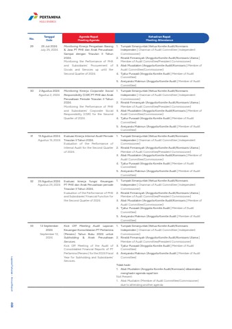 No. TanggalDateAgenda RapatMeeting AgendaKehadiran RapatMeeting Attendance29 25 Juli 2024July 25, 2024Monitoring Kinerja Pengadaan Barang & Jasa PT PHE dan Anak Perusahaan Sampai dengan Triwulan II Tahun 2024.Monitoring the Performance of PHE and Subsidiaries' Procurement of Goods and Services up until the Second Quarter of 2024.1. Tumpak Simanjuntak (Ketua Komite Audit/Komisaris Independen | Chairman of Audit Committee | Independent Commissioner)2. Rinaldi Firmansyah (Anggota Komite Audit/Komisaris Utama | Member of Audit Committee/President Commissioner)3. Abdi Musatakim (Anggota Komite Audit/Komisaris | Member of Audit Committee/Commissioner)4. Tjatur Purwadi (Anggota Komite Audit | Member of Audit Committee)5. Areiyando Makmun (Anggota Komite Audit | Member of Audit Committee)30 2 Agustus 2024Agustus 2, 2024Monitoring Kinerja Corporate Social Responsibility (CSR) PT PHE dan Anak Perusahaan Periode Triwulan II Tahun 2024.Monitoring the Performance of PHE and Subsidiaries%u2019 Corporate Social Responsibility (CSR) for the Second Quarter of 2024.1. Tumpak Simanjuntak (Ketua Komite Audit/Komisaris Independen | Chairman of Audit Committee | Independent Commissioner)2. Rinaldi Firmansyah (Anggota Komite Audit/Komisaris Utama | Member of Audit Committee/President Commissioner)3. Abdi Musatakim (Anggota Komite Audit/Komisaris | Member of Audit Committee/Commissioner)4. Tjatur Purwadi (Anggota Komite Audit | Member of Audit Committee)5. Areiyando Makmun (Anggota Komite Audit | Member of Audit Committee)31 13 Agustus 2024Agustus 13, 2024Evaluasi Kinerja Internal Audit Periode Triwulan II Tahun 2024.Evaluation of the Performance of Internal Audit for the Second Quarter of 2024.1. Tumpak Simanjuntak (Ketua Komite Audit/Komisaris Independen | Chairman of Audit Committee | Independent Commissioner)2. Rinaldi Firmansyah (Anggota Komite Audit/Komisaris Utama | Member of Audit Committee/President Commissioner)3. Abdi Musatakim (Anggota Komite Audit/Komisaris | Member of Audit Committee/Commissioner)4. Tjatur Purwadi (Anggota Komite Audit | Member of Audit Committee)5. Areiyando Makmun (Anggota Komite Audit | Member of Audit Committee)32 23 Agustus 2024Agustus 23, 2024Evaluasi kinerja fungsi Keuangan PT PHE dan Anak Perusahaan periode Triwulan II Tahun 2024.Evaluation of the Performance of PHE and Subsidiaries' Financial Function for the Second Quarter of 2024.1. Tumpak Simanjuntak (Ketua Komite Audit/Komisaris Independen | Chairman of Audit Committee | Independent Commissioner)2. Rinaldi Firmansyah (Anggota Komite Audit/Komisaris Utama | Member of Audit Committee/President Commissioner)3. Abdi Musatakim (Anggota Komite Audit/Komisaris | Member of Audit Committee/Commissioner)4. Tjatur Purwadi (Anggota Komite Audit | Member of Audit Committee)5. Areiyando Makmun (Anggota Komite Audit | Member of Audit Committee)33 12 September 2024September 12, 2024Kick Off Meeting Audit Laporan Keuangan Konsolidasian PT Pertamina (Persero) Tahun Buku 2024 untuk Subholding & Anak Perusahaan Services.Kick Off Meeting of the Audit of Consolidated Financial Reports of PT Pertamina (Persero) for the 2024 Fiscal Year for Subholding and Subsidiaries%u2019 Services.1. Tumpak Simanjuntak (Ketua Komite Audit/Komisaris Independen | Chairman of Audit Committee | Independent Commissioner)2. Rinaldi Firmansyah (Anggota Komite Audit/Komisaris Utama | Member of Audit Committee/President Commissioner)3. Tjatur Purwadi (Anggota Komite Audit | Member of Audit Committee)4. Areiyando Makmun (Anggota Komite Audit | Member of Audit Committee)Tidak hadir:1. Abdi Mustakim (Anggota Komite Audit/Komisaris) dikarenakan menghadiri agenda rapat lainNot Present:1. Abdi Mustakim (Member of Audit Committee/Commissioner) due to attending another agendaLaporan Tahunan %u2022 Annual Report 464HULU ENERGI