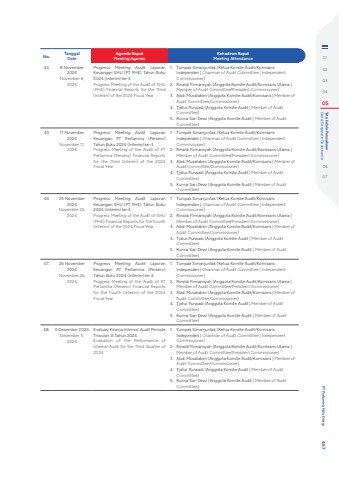 No. TanggalDateAgenda RapatMeeting AgendaKehadiran RapatMeeting Attendance44 8 November 2024November 8, 2024Progress Meeting Audit Laporan Keuangan SHU (PT PHE) Tahun Buku 2024 (Interim) ke-3Progress Meeting of the Audit of SHU (PHE) Financial Reports for the Third (Interim) of the 2024 Fiscal Year1. Tumpak Simanjuntak (Ketua Komite Audit/Komisaris Independen | Chairman of Audit Committee | Independent Commissioner)2. Rinaldi Firmansyah (Anggota Komite Audit/Komisaris Utama | Member of Audit Committee/President Commissioner)3. Abdi Musatakim (Anggota Komite Audit/Komisaris | Member of Audit Committee/Commissioner)4. Tjatur Purwadi (Anggota Komite Audit | Member of Audit Committee)5. Kurnia Sari Dewi (Anggota Komite Audit | Member of Audit Committee)45 11 November 2024November 11, 2024Progress Meeting Audit Laporan Keuangan PT Pertamina (Persero) Tahun Buku 2024 (Interim) ke-3Progress Meeting of the Audit of PT Pertamina (Persero) Financial Reports for the Third (Interim) of the 2024 Fiscal Year1. Tumpak Simanjuntak (Ketua Komite Audit/Komisaris Independen | Chairman of Audit Committee | Independent Commissioner)2. Rinaldi Firmansyah (Anggota Komite Audit/Komisaris Utama | Member of Audit Committee/President Commissioner)3. Abdi Musatakim (Anggota Komite Audit/Komisaris | Member of Audit Committee/Commissioner)4. Tjatur Purwadi (Anggota Komite Audit | Member of Audit Committee)5. Kurnia Sari Dewi (Anggota Komite Audit | Member of Audit Committee)46 25 November 2024November 25, 2024Progress Meeting Audit Laporan Keuangan SHU (PT PHE) Tahun Buku 2024 (Interim) ke-4Progress Meeting of the Audit of SHU (PHE) Financial Reports for the Fourth (Interim) of the 2024 Fiscal Year1. Tumpak Simanjuntak (Ketua Komite Audit/Komisaris Independen | Chairman of Audit Committee | Independent Commissioner)2. Rinaldi Firmansyah (Anggota Komite Audit/Komisaris Utama | Member of Audit Committee/President Commissioner)3. Abdi Musatakim (Anggota Komite Audit/Komisaris | Member of Audit Committee/Commissioner)4. Tjatur Purwadi (Anggota Komite Audit | Member of Audit Committee)5. Kurnia Sari Dewi (Anggota Komite Audit | Member of Audit Committee)47. 26 November 2024November 26, 2024Progress Meeting Audit Laporan Keuangan PT Pertamina (Persero) Tahun Buku 2024 (Interim) ke-4Progress Meeting of the Audit of PT Pertamina (Persero) Financial Reports for the Fourth (Interim) of the 2024 Fiscal Year1. Tumpak Simanjuntak (Ketua Komite Audit/Komisaris Independen | Chairman of Audit Committee | Independent Commissioner)2. Rinaldi Firmansyah (Anggota Komite Audit/Komisaris Utama | Member of Audit Committee/President Commissioner)3. Abdi Musatakim (Anggota Komite Audit/Komisaris | Member of Audit Committee/Commissioner)4. Tjatur Purwadi (Anggota Komite Audit | Member of Audit Committee)5. Kurnia Sari Dewi (Anggota Komite Audit | Member of Audit Committee)48. 5 Desember 2024December 5, 2024Evaluasi Kinerja Internal Audit Periode Triwulan III Tahun 2024Evaluation of the Performance of Internal Audit for the Third Quarter of 20241. Tumpak Simanjuntak (Ketua Komite Audit/Komisaris Independen | Chairman of Audit Committee | Independent Commissioner)2. Rinaldi Firmansyah (Anggota Komite Audit/Komisaris Utama | Member of Audit Committee/President Commissioner)3. Abdi Musatakim (Anggota Komite Audit/Komisaris | Member of Audit Committee/Commissioner)4. Tjatur Purwadi (Anggota Komite Audit | Member of Audit Committee)5. Kurnia Sari Dewi (Anggota Komite Audit | Member of Audit Committee)0102030405 Good Corporate Governance Tata kelola Perusahaan0607 PT Pertamina Hulu Energi 467