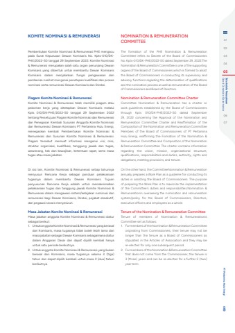 KOMITE NOMINASI & REMUNERASIPembentukan Komite Nominasi & Remunerasi PHE mengacu pada Surat Keputusan Dewan Komisaris No. Kpts-010/DKPHE/2022-S0 tanggal 29 September 2022. Komite Nominasi & Remunerasi merupakan salah satu organ penunjang Dewan Komisaris yang dibentuk untuk membantu Dewan Komisaris Komisaris dalam menjalankan fungsi pengawasan dan pemberian nasihat mengenai penetapan kualifikasi dan proses nominasi serta remunerasi Dewan Komisaris dan Direksi.Piagam Komite Nominasi & RemunerasiKomite Nominasi & Remunerasi telah memiliki piagam atau pedoman kerja yang ditetapkan Dewan Komisaris melalui Kpts 010/DK-PHE/2022-S0 tanggal 29 September 2022 tentang Persetujuan Piagam Komite Nominasi dan Remunerasi dan Penegasan Kembali Susunan Anggota Komite Nominasi dan Remunerasi Dewan Komisaris PT Pertamina Hulu Energi, menegaskan kembali Pembentukan Komite Nominasi & Remunerasi dan Susunan Komite Nominasi & Remunerasi. Piagam tersebut memuat informasi mengenai visi, misi, struktur organisasi, kualifikasi, tanggung jawab dan tugas, wewenang, hak dan kewajiban, ketentuan rapat, serta masa tugas atau masa jabatan.Di sisi lain, Komite Nominasi & Remunerasi setiap tahunnya menyusun Rencana Kerja sebagai panduan pelaksanaan tugasnya dalam membantu Dewan Komisaris. Tujuan penyusunan Rencana Kerja adalah untuk memaksimalkan pelaksanaan tugas dan tanggung jawab Komite Nominasi & Remunerasi dalam mengawasi sistem/kebijakan nominasi dan remunerasi bagi Dewan Komisaris, Direksi, pejabat eksekutif, dan pegawai secara menyeluruh.Masa Jabatan Komite Nominasi & RemunerasiMasa jabatan anggota Komite Nominasi & Remunerasi diatur sebagai berikut:1. Untuk anggota Komite Nominasi & Remunerasi yang berasal dari Komisaris, masa tugasnya tidak boleh lebih lama dari masa jabatan sebagai Dewan Komisaris sebagaimana diatur dalam Anggaran Dasar dan dapat dipilih kembali hanya untuk satu periode berikutnya. 2. Untuk anggota Komite Nominasi & Remunerasi yang bukan berasal dari Komisaris, masa tugasnya selama 3 (tiga) tahun dan dapat dipilih kembali untuk masa 2 (dua) tahun berikutnya. NOMINATION & REMUNERATION COMMITTEEThe formation of the PHE Nomination & Remuneration Committee refers to Decree of the Board of Commissioners No. Kpts-010/DK-PHE/2022-S0 dated September 29, 2022.The Nomination & Remuneration Committee is one of the supporting organs of the Board of Commissioners which is formed to assist the Board of Commissioners in conducting its supervisory and advisory functions regarding the determination of qualifications and the nomination process as well as remuneration of the Board of Commissioners and Board of Directors.Nomination & Remuneration Committee CharterCommittee Nomination & Remuneration has a charter or work guidelines established by the Board of Commissioners through Kpts 010/DK-PHE/2022-S0 dated September 29, 2022 concerning the Approval of the Nomination and Remuneration Committee Charter and Reaffirmation of the Composition of the Nomination and Remuneration Committee Members of the Board of Commissioners of PT Pertamina Hulu Energi, reaffirming the Formation of the Nomination & Remuneration Committee and Composition of the Nomination & Remuneration Committee. The charter contains information regarding the vision, mission, organizational structure, qualifications, responsibilities and duties, authority, rights and obligations, meeting provisions, and tenure.On the other hand, the CommitteeNomination & Remuneration annually prepares a Work Plan as a guideline for conducting its duties in assisting the Board of Commissioners. The purpose of preparing the Work Plan is to maximize the implementation of the Committee's duties and responsibilities.Nomination & Remunerationin overseeing the nomination and remuneration system/policy for the Board of Commissioners, Directors, executive officers and employees as a whole.Tenure of the Nomination & Remuneration CommitteeTenure of members of Nomination & Remunerationis Committee set as follows:1. For members of the Nomination & Remuneration Committee originating from Commissioners, their tenure may not be longer than the tenure as a Board of Commissioners as stipulated in the Articles of Association and they may be re-elected for only one subsequent period.2. For members of the Nomination & Remuneration Committee that does not come from the Commissioner, the tenure is 3 (three) years and can be re-elected for a further 2 (two) year term.0102030405 Good Corporate Governance Tata kelola Perusahaan0607 PT Pertamina Hulu Energi 469