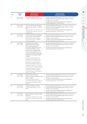 No. TanggalDateAgenda RapatMeeting AgendaKehadiran RapatMeeting Attendance11 25 Juni 2025June 25, 2025Kinerja Perusahaan Mei 2025Company Performance May 20241. Tutuka Ariadji (Ketua/Komisaris | Chairman/Commissioners)2. Rinaldi Firmansyah (Anggota/Komisaris Utama | Member/President Commissioners)3. Tumpak Simanjuntak (Anggota/Komisaris Independen | Member/Independent Commissioner)12 8 Juli 2025July 8, 2025Sesi Interview Rencana Pengisian Posisi Director & COO %u2013 PT Badak NGLInterview Session for the Plan to Fill in the Position of Director & COO %u2013 PT Badak NGL1. Tutuka Ariadji (Ketua/Komisaris | Chairman/Commissioners)2. Rinaldi Firmansyah (Anggota/Komisaris Utama | Member/President Commissioners)3. Tumpak Simanjuntak (Anggota/Komisaris Independen | Member/Independent Commissioner)13 10 Juli 2025July 10, 2025Sesi Interview Rencana Pengisian Posisi Direktur Operasi DSLNGInterview Session for the Plan to Fill in the Position of DSLNG Operations Director1. Tutuka Ariadji (Ketua/Komisaris | Chairman/Commissioners)2. Rinaldi Firmansyah (Anggota/Komisaris Utama | Member/President Commissioners)3. Tumpak Simanjuntak (Anggota/Komisaris Independen | Member/Independent Commissioner)14 12 Juli 2025July 12, 2025Pembahasan Permohonan Rekomendasi Tertulis Dewan Komisaris atas Persetujuan Penempatan Wakil PT Pertamina Hulu Energi (%u201cPT PHE%u201d) untuk Menjadi Calon Anggota Direksi di PT Pertamina Drilling Services Indonesia (%u201cPT PDSI%u201d) sehubungan Perubahan Nomenklatur Direksi PT PDSIDiscussion of the Request for Written Recommendation from the Board of Commissioners for Approval of the Placement of PHE Representatives to Become Candidate Members of the Board of Directors at PT Pertamina Drilling Services Indonesia (%u201cPT PDSI%u201d) in connection with the Change in the Nomenclature of the Board of Directors of PT PDSI1. Tutuka Ariadji (Ketua/Komisaris | Chairman/Commissioners)2. Rinaldi Firmansyah (Anggota/Komisaris Utama | Member/President Commissioners)3. Tumpak Simanjuntak (Anggota/Komisaris Independen | Member/Independent Commissioner)15 12 Juli 2025July 12, 2025Rapat Komite Nominasi & Remunerasi Dekom PHE dan Fungsi HSSE %u2013 HealthNomination & Remuneration Committee Meeting with regard to PHE Dekom and HSSE Function %u2013 Health1. Tutuka Ariadji (Ketua/Komisaris | Chairman/Commissioners)2. Rinaldi Firmansyah (Anggota/Komisaris Utama | Member/President Commissioners)3. Tumpak Simanjuntak (Anggota/Komisaris Independen | Member/Independent Commissioner)16 25 Juli 2025July 25, 2025Kinerja Perusahaan Juni 2025Company Performance of June 20241. Tutuka Ariadji (Ketua/Komisaris | Chairman/Commissioners)2. Rinaldi Firmansyah (Anggota/Komisaris Utama | Member/President Commissioners)3. Tumpak Simanjuntak (Anggota/Komisaris Independen | Member/Independent Commissioner)17 31 Juli 2025July 31, 2025Rapat Pemaparan Legal End stateWK Rokan Presentation Meeting of the Legal End State for Rokan Working Area (WK)1. Tutuka Ariadji (Ketua/Komisaris | Chairman/Commissioners)2. Rinaldi Firmansyah (Anggota/Komisaris Utama | Member/President Commissioners)3. Tumpak Simanjuntak (Anggota/Komisaris Independen | Member/Independent Commissioner)0102030405 Good Corporate Governance Tata kelola Perusahaan0607 PT Pertamina Hulu Energi 477