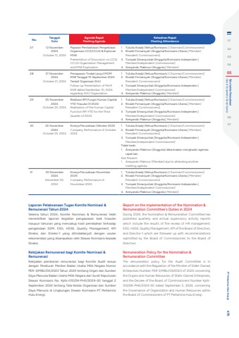 No. TanggalDateAgenda RapatMeeting AgendaKehadiran RapatMeeting Attendance27 12 November 2024October 12, 2024Paparan Pembahasan Pengelolaan Organisasi CCS/CCUS & Explorasi MNKPresentation of Discussion on CCS/CCUS Organization Management and MNK Exploration1. Tutuka Ariadji (Ketua/Komisaris | Chairman/Commissioners)2. Rinaldi Firmansyah (Anggota/Komisaris Utama | Member/President Commissioners)3. Tumpak Simanjuntak (Anggota/Komisaris Independen | Member/Independent Commissioner)4. Areiyando Makmun (Anggota | Member)28 21 November 2024October 21, 2024Pemaparan Tindak Lanjut MOM KNR Tanggal 10 September 2024 Terkait Organisasi SHUFollow-up Presentation of MoM KNR dated September 10, 2024 regarding SHU Organization1. Tutuka Ariadji (Ketua/Komisaris | Chairman/Commissioners)2. Rinaldi Firmansyah (Anggota/Komisaris Utama | Member/President Commissioners)3. Tumpak Simanjuntak (Anggota/Komisaris Independen | Member/Independent Commissioner)4. Areiyando Makmun (Anggota | Member)29 25 November 2024October 25, 2024Realisasi KPI Fungsi Human Capital YTD Triwulan III 2024Realization of the Human Capital Function KPI YTD for the Third Quarter of 20241. Tutuka Ariadji (Ketua/Komisaris | Chairman/Commissioners)2. Rinaldi Firmansyah (Anggota/Komisaris Utama | Member/President Commissioners)3. Tumpak Simanjuntak (Anggota/Komisaris Independen | Member/Independent Commissioner)4. Areiyando Makmun (Anggota | Member)30 25 November 2024October 25, 2024Kinerja Perusahaan Oktober 2025Company Performance of October 20241. Tutuka Ariadji (Ketua/Komisaris | Chairman/Commissioners)2. Rinaldi Firmansyah (Anggota/Komisaris Utama | Member/President Commissioners)3. Tumpak Simanjuntak (Anggota/Komisaris Independen | Member/Independent Commissioner)Tidak hadir:1. Areiyando Makmun (Anggota) dikarenakan menghadiri agenda rapat lainNot Present:1. Areiyando Makmun (Member) due to attending another meeting agenda31 20 Desember 2024December 20, 2024Kinerja Perusahaan November 2025Company Performance of November 20241. Tutuka Ariadji (Ketua/Komisaris | Chairman/Commissioners)2. Rinaldi Firmansyah (Anggota/Komisaris Utama | Member/President Commissioners)3. Tumpak Simanjuntak (Anggota/Komisaris Independen | Member/Independent Commissioner)4. Areiyando Makmun (Anggota | Member)Laporan Pelaksanaan Tugas Komite Nominasi & Remunerasi Tahun 2024Selama tahun 2024, Komite Nominasi & Remunerasi telah menerbitkan laporan kegiatan pengawasan baik triwulan maupun tahunan yang mencakup hasil penelaahan terhadap pengelolaan SDM, ESG, HSSE, Quality Management, KPI Direksi, dan Direksi-1 yang ditindaklanjuti dengan usulan rekomendasi yang disampaikan oleh Dewan Komisaris kepada Direksi. Kebijakan Remunerasi bagi Komite Nominasi & RemunerasiKebijakan pemberian remunerasi bagi Komite Audit sesuai dengan Peraturan Menteri Badan Usaha Milik Negara Nomor PER-3/MBU/03/2023 Tahun 2023 tentang Organ dan Sumber Daya Manusia Badan Usaha Milik Negara dan Surat Keputusan Dewan Komisaris No. Kpts-012/DK-PHE/2024-S0 tanggal 2 September 2024 tentang Tata Kelola Organisasi dan Sumber Daya Manusia di Lingkungan Dewan Komisaris PT Pertamina Hulu Energi.Report on the Implementation of the Nomination & Remuneration Committee's Duties in 2024During 2024, the Nomination & Remuneration Committee has published quarterly and annual supervisory activity reports which include the results of the review of HR management, ESG, HSSE, Quality Management, KPI of the Board of Directors, and Director-1 which are followed up with recommendations submitted by the Board of Commissioners to the Board of Directors.Remuneration Policy for the Nomination & Remuneration CommitteeThe remuneration policy for the Audit Committee is In accordance with the Regulation of the Minister of State-Owned Enterprises Number PER-3/MBU/03/2023 of 2023 concerning the Organs and Human Resources of State-Owned Enterprises, and the Decree of the Board of Commissioners Number Kpts012/DK-PHE/2024-S0 dated September 2, 2024, concerning the Governance of Organization and Human Resources within the Board of Commissioners of PT Pertamina Hulu Energi. 0102030405 Good Corporate Governance Tata kelola Perusahaan0607 PT Pertamina Hulu Energi 479