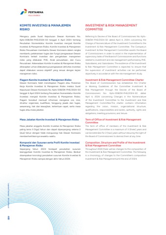 KOMITE INVESTASI & MANAJEMEN RISIKOMengacu pada Surat Keputusan Dewan Komisaris No. Kpts-008/DK-PHE/2024-S0 tanggal 4 April 2024 tentang Perubahan Nomenklatur Komite Investasi menjadi Komite Investasi & Manajemen Risiko. Komite Investasi & Manajemen Risiko Perusahaan membantu Dewan Komisaris dalam rangka membantu pelaksanaan tugas dan fungsi pengawasan Dewan Komisaris terkait investasi dan pengelolaan manajemen risiko yang dilakukan PHE, Anak perusahaan, dan Cucu Perusahaan. Keberadaan Komite Investasi & Manajemen Risiko diharapkan untuk dilakukannya pengawasan aktivitas investasi dapat dilakukan secara objektif yang sesuai dengan kajian manajemen risiko. Piagam Komite Investasi & Manajemen RisikoDewan Komisaris telah menetapkan Piagam atau Pedoman Kerja Komite Investasi & Manajemen Risiko melalui Surat Keputusan Dewan Komisaris No. Kpts-008/DK-PHE/2024-S0 tanggal 4 April 2024 tentang Perubahan Nomenklatur Komite Investasi menjadi Komite Investasi & Manajemen Risiko. Piagam tersebut memuat informasi mengenai visi, misi, struktur organisasi, kualifikasi, tanggung jawab dan tugas, wewenang, hak dan kewajiban, ketentuan rapat, serta masa tugas atau masa jabatan. Masa Jabatan Komite Investasi & Manajemen RisikoMasa jabatan anggota Komite Investasi & Manajemen Risiko paling lama 3 (tiga) tahun dan dapat diperpanjang selama 2 (dua) tahun dengan tidak mengurangi hak Dewan Komisaris memberhentikannya sewaktu-waktu.Komposisi dan Susunan serta Profil Komite Investasi & Manajemen RisikoSepanjang tahun 2024 terdapat perubahan susunan keanggotaan Komite Investasi & Manajemen Risiko. Berikut disampaikan kronologi perubahan susunan Komite Investasi & Manajemen Risiko sampai dengan akhir tahun 2024.INVESTMENT & RISK MANAGEMENT COMMITTEEReferring to Decree of the Board of Commissioners No. Kpts008/DK-PHE/2024-S0 dated April 4, 2024 concerning the Change of Nomenclature of the Investment Committee to the Investment & Risk Management Committee. The Company's Investment & Risk Management Committee assists the Board of Commissioners in order to assist in the implementation of supervisory tasks of the Board of Commissioners and functions related to investment and risk management performed by PHE, Subsidiaries, and Subsidiaries. The existence of the Investment & Risk Management Committee is expected to ensure that the supervision of investment activities can be performed objectively in accordance with the risk management study.Investment & Risk Management Committee CharterThe Board of Commissioners has established the Charter or Working Guidelines of the Committee Investment & Risk Management through the Decree of the Board of Commissioners No. Kpts-008/DK-PHE/2024-S0 dated April 4, 2024 concerning Changes in the Nomenclature of the Investment Committee to the Investment and Risk Management Committee.The charter contains information regarding the vision, mission, organizational structure, qualifications, responsibilities and duties, authority, rights and obligations, meeting provisions, and tenure.Term of Office of Investment & Risk Management Committee The term of office of members of the Investment & Risk Management Committee is a maximum of 3 (three) years and can be extended for 2 (two) years without reducing the right of the Board of Commissioners to dismiss them at any time.Composition, Structure and Profile of the Investment & Risk Management CommitteeThroughout 2024 there will be changes to the composition of the Investment & Risk Management Committee. The following is a chronology of changes to the Committee's composition Investment & Risk Managementuntil the end of 2024.Laporan Tahunan %u2022 Annual Report 480HULU ENERGI