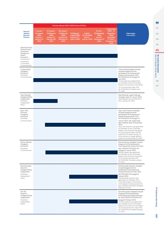 Nama & JabatanName & PositionPeriode Jabatan 2024 I 2024 Terms of OfficeKeteranganInformation1 Januari - 10 Januari 2024January 1 - January 10, 202410 Januari - 20 Februari 2024January 10 - February 20, 202420 Januari - 12 Februari 2024January 20 - February 12, 2024 12 Februari - 4 April 2024February 12 - April 4, 20244 April - 10 Juni 2024April 4 - June 10, 202410 Juni - 31 Desember 2024June 10 - December 31, 202417 Desember 2024 - 31 Desember 2024December 17, 2024 - December 31, 2024Nanang Untung (Ketua Komite Investasi & Manajemen Risiko/Komisaris)(Chairman of Investment Committee/Commissioner)-Tutuka Ariadji(Anggota/Komisaris)(Member/Commissioner)Tutuka Aiadji diangkat kembali menjadi Anggota Komite berdasarkan Surat Keputusan Dewan Komisaris Kpts-010/DK-PHE/2024-S0 tanggal 10 Juni 2024.Tutuka Aiadji was reappointed as a Member of the Committee based on the Decree of the Board of Commissioners Kpts-010/DK-PHE/2024-S0 dated June 10, 2024.Sigit Rahardjo(Anggota/Pihak Independen)(Member/Independent Party)Sigit Rahardjo sudah tidak lagi menjabat sejak 20 Januari 2024.Sigit Rahardjo has not held office since January 20, 2024.Agus Joko Pramono (Anggota/Komisaris)(Member/Commissioner)Agus Joko Pramono diangkat menjadi Anggota Komite berdasarkan Surat Keputusan Dewan Komisaris Kpts-001/DK-PHE/2024-S0 tanggal 10 Januari 2024, dan sudah tidak lagi menjabat sejak 16 Desember 2024.Agus Joko Pramono was appointed as a Member of the Committee based on the Decree of the Board of Commissioners Kpts-001/DKPHE/2024-S0 dated January 10, 2024, and has no longer held the position since December 16, 2024.Paiman Raharjo (Anggota/Komisaris)(Member/Commissioner)Paiman Raharjo diangkat menjadi Anggota Komite berdasarkan Surat Keputusan Dewan Komisaris Kpts-001/DK-PHE/2024-S0 tanggal 10 Januari 2024Paiman Raharjo was appointed as a Member of the Committee based on the Decree of the Board of Commissioners Kpts-001/DK-PHE/2024-S0 dated January 10, 2024.Rizal Djunaedy Nasution(Anggota/Pihak Independen)(Member/Independent Party)Rizal Djunaedy Nasution diangkat menjadi Anggota Komite berdasarkan Surat Keputusan Dewan Komisaris No. Kpts-004/DK-PHE/2024-S0 tanggal 12 Februari 2024Rizal Djunaedy Nasution was appointed as a Member of the Committee based on the Decree of the Board of Commissioners No. Kpts-004/DK-PHE/2024-S0 dated February 12, 2024.Dwi Adi Nugroho(Anggota/Pihak Independen)(Member/Independent Party)Dwi Adi Nugroho diangkat menjadi Anggota Komite berdasarkan Surat Keputusan Dewan Komisaris No. Kpts-005/DK-PHE/2024-S0 tanggal 12 Februari 2024.Dwi Adi Nugroho was appointed as a Member of the Committee based on the Decree of the Board of Commissioners No. Kpts-005/DK-PHE/2024-S0 dated February 12, 2024.0102030405 Good Corporate Governance Tata kelola Perusahaan0607 PT Pertamina Hulu Energi 481