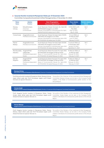 Susunan Komite Investasi & Manajemen Risiko per 31 Desember 2024Committee CompositionInvestment & Risk Managementas of December 31, 2024NamaNameJabatanPositionDasar PengangkatanGround of Appointment Masa JabatanTenurePeriode JabatanTenureNanang UntungKetua/KomisarisChairman/CommissionerSurat Keputusan Dewan Komisaris No. Kpts-06/DK/PHE/2023 tanggal 5 Juni 2023Decree of the Board of Commissioners No. Kpts06/DK/PHE/2023 dated June 5, 202315 Mei 2023 s.d 15 Mei 2026May 15, 2023 - May 15, 2026Ke-22ndTutuka Ariadji Anggota/KomisarisMember/CommissionerSurat Keputusan Dewan Komisaris Kpts-010/DKPHE/2024-S0 tanggal 10 Juni 2024Decree of the Board of Commissioners Kpts-010/DK-PHE/2024-S0 dated June 10, 202410 Juni 2024 s.d 15 Februari 2027June 10, 2024 - February 15, 2027Ke-22ndPaiman RaharjoAnggota/KomisarisMember/CommissionerSurat Keputusan Dewan Komisaris Kpts-001/DKPHE/2024-S0 tanggal 10 Januari 2024Decree of the Board of Commissioners Kpts-001/DK-PHE/2024-S0 dated January 10, 202410 Januari 2024 s.d 21 November 2027January 10, 2024 - September 21, 2027Ke-11stRizal Djunaedy NasutionAnggota/Pihak IndependenMembers/Independent PartiesSurat Keputusan Dewan Komisaris No. Kpts-004/DK-PHE/2024-S0 tanggal 12 Februari 2024Board of Commissioners Decree No. Kpts-004/DK-PHE/2024-S0 dated February 12, 202412 Februari 2024 s.d 12 Februari 2027February 12, 2024 - February 12, 2027Ke-11stDwi Adi NugrohoAnggota/Pihak IndependenMembers/Independent PartiesSurat Keputusan Dewan Komisaris No. Kpts-005/DK-PHE/2024-S0 tanggal 12 Februari 2024Board of Commissioners Decree No. Kpts-005/DK-PHE/2024-S0 dated February 12, 202412 Februari 2024 s.d 12 Februari 2027February 12, 2024 - February 12, 2027Ke-11stProfil Ketua Komite Investasi & Manajemen Risiko, Nanang Untung, dapat dilihat pada bab Profil Perusahaan bagian profil Dewan Komisaris di Laporan Tahunan iniThe profile of the Chairman of the Investment & Risk Management Committee, Nanang Untung, can be seen in the Company Profile chapter in the Board of Commissioners profile section of this Annual Report.Profil Anggota Komite Investasi & Manajemen Risiko, Tutuka Ariadji, dapat dilihat pada bab Profil Perusahaan bagian profil Dewan Komisaris di Laporan Tahunan ini.The profile of the Member of the Investment & Risk Management Committee, Tutuka Ariadji, can be seen in the Company Profile chapter in the Board of Commissioners profile section of this Annual Report.Profil Anggota Komite Investasi & Manajemen Risiko, Paiman Raharjo, dapat dilihat pada bab Profil Perusahaan bagian profil Dewan Komisaris di Laporan Tahunan ini.The profile of the Member of the Investment & Risk Management Committee, Paiman Raharjo, can be seen in the Company Profile chapter in the Board of Commissioners profile section of this Annual Report.Nanang UntungKetua Komite Investasi & Manajemen Risiko/Komisaris | Chairman of Investment & Risk Management Committee/CommissionerTutuka AriadjiAnggota Komite Investasi & Manajemen Risiko/Komisaris | Member of Investment & Risk Management Committee/CommissionerPaiman RaharjoAnggota Komite Investasi & Manajemen Risiko/Komisaris | Member of Investment & Risk Management Committee/CommissionerLaporan Tahunan %u2022 Annual Report 482HULU ENERGI