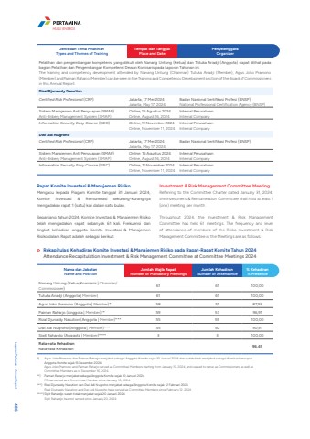 Jenis dan Tema PelatihanTypes and Themes of TrainingTempat dan TanggalPlace and DatePenyelenggaraOrganizerPelatihan dan pengembangan kompetensi yang diikuti oleh Nanang Untung (Ketua) dan Tutuka Ariadji (Anggota) dapat dilihat pada bagian Pelatihan dan Pengembangan Kompetensi Dewan Komisaris pada Laporan Tahunan ini.The training and competency development attended by Nanang Untung (Chairman) Tutuka Ariadji (Member), Agus Joko Pramono (Member) and Paiman Raharjo (Member) can be seen in the Training and Competency Development section of the Board of Commissioners in this Annual Report.Rizal Djunaedy Nasution Certified Risk Profesional (CRP) Jakarta, 17 Mei 2024Jakarta, May 17, 2024Badan Nasional Sertifikasi Profesi (BNSP)National Professional Certification Agency (BNSP)Sistem Manajemen Anti Penyuapan (SMAP)Anti-Bribery Management System (SMAP)Online, 16 Agustus 2024Online, August 16, 2024Internal PerusahaanInternal CompanyInformation Security Easy Course (ISEC) Online, 11 November 2024Online, November 11, 2024Internal PerusahaanInternal CompanyDwi Adi NugrohoCertified Risk Profesional (CRP) Jakarta, 17 Mei 2024Jakarta, May 17, 2024Badan Nasional Sertifikasi Profesi (BNSP)Sistem Manajemen Anti Penyuapan (SMAP)Anti-Bribery Management System (SMAP)Online, 16 Agustus 2024Online, August 16, 2024Internal PerusahaanInternal CompanyInformation Security Easy Course (ISEC) Online, 11 November 2024Online, November 11, 2024Internal PerusahaanInternal CompanyRapat Komite Investasi & Manajemen RisikoMengacu kepada Piagam Komite tanggal 31 Januari 2024, Komite Investasi & Remunerasi sekurang-kurangnya mengadakan rapat 1 (satu) kali dalam satu bulan. Sepanjang tahun 2024, Komite Investasi & Manajemen Risiko telah mengadakan rapat sebanyak 61 kali. Frekuensi dan tingkat kehadiran anggota Komite Investasi & Manajemen Risiko dalam Rapat adalah sebagai berikut:Investment & Risk Management Committee MeetingReferring to the Committee Charter dated January 31, 2024, the Investment & Remuneration Committee shall hold at least 1 (one) meeting per month. Throughout 2024, the Investment & Risk Management Committee has held 61 meetings. The frequency and level of attendance of members of the Ririko Investment & Risk Management Committee in the Meetings are as follows:Rekapitulasi Kehadiran Komite Investasi & Manajemen Risiko pada Rapat-Rapat Komite Tahun 2024Attendance Recapitulation Investment & Risk Management Committee at Committee Meetings 2024Nama dan JabatanName and PositionJumlah Wajib RapatNumber of Mandatory MeetingsJumlah KehadiranNumber of Attendance% Kehadiran% PresenceNanang Untung (Ketua/Komisaris | Chairman/Commissioner) 61 61 100,00Tutuka Ariadji (Anggota | Member) 61 61 100,00Agus Joko Pramono (Anggota | Member)* 58 51 87,93Paiman Raharjo (Anggota | Member)** 59 57 96,91Rizal Djunaidy Nasution (Anggota | Member)*** 55 55 100,00Dwi Adi Nugroho (Anggota | Member)*** 55 50 90,91Sigit Rahardjo (Anggota | Member)**** 3 3 100,00Rata-rata KehadiranRata-rata Kehadiran 96,49*) Agus Joko Pramono dan Paiman Raharjo menjabat sebagai Anggota Komite sejak 10 Januari 2024 dan sudah tidak menjabat sebagai Komisaris maupun Anggota Komite sejak 16 Desember 2024Agus Joko Pramono and Paiman Raharjo served as Committee Members starting from January 10, 2024, and ceased to serve as Commissioners as well as Committee Members as of December 16, 2024.**) Paiman Raharjo menjabat sebagai Anggota Komite sejak 10 Januari 2024PR has served as a Committee Member since January 10, 2024.***) Rizal Djunaedy Nasution dan Dwi Adi Nugroho menjabat sebagai Anggota Komite sejak 12 Februari 2024Rizal Djunaedy Nasution and Dwi Adi Nugroho have served as Committee Members since February 12, 2024****)Sigit Rahardjo sudah tidak menjabat sejak 20 Januari 2024Sigit Rahardjo has not served since January 20, 2024Laporan Tahunan %u2022 Annual Report 486HULU ENERGI