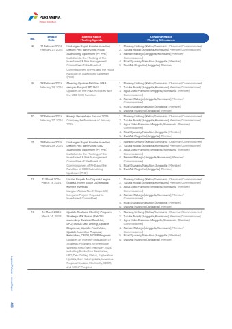 No. TanggalDateAgenda RapatMeeting AgendaKehadiran RapatMeeting Attendance8 21 Februari 2024February 21, 2024Undangan Rapat Komite Investasi Dekom PHE dan Fungsi HSSE Subholding Upstream (PT PHE)Invitation to the Meeting of the Investment & Risk Management Committee of the Board of Commissioners of PHE and the HSSE Function of Subholding Upstream (PHE)1. Nanang Untung (Ketua/Komisaris | Chairman/Commissioner)2. Tutuka Ariadji (Anggota/Komisaris | Member/Commissioner)3. Paiman Raharjo (Anggota/Komisaris | Member/Commissioner)4. Rizal Djunaidy Nasution (Anggota | Member) 5. Dwi Adi Nugroho (Anggota | Member)9 23 Februari 2024February 23, 2024Meeting Update Aktifitas M&A dengan Fungsi UBD SHU Updates on the M&A Activities with the UBD SHU Function1. Nanang Untung (Ketua/Komisaris | Chairman/Commissioner)2. Tutuka Ariadji (Anggota/Komisaris | Member/Commissioner)3. Agus Joko Pramono (Anggota/Komisaris | Member/Commissioner)4. Paiman Raharjo (Anggota/Komisaris | Member/Commissioner)5. Rizal Djunaidy Nasution (Anggota | Member) 6. Dwi Adi Nugroho (Anggota | Member)10 27 Februari 2024February 27, 2024Kinerja Perusahaan Januari 2025Company Performance of January 20241. Nanang Untung (Ketua/Komisaris | Chairman/Commissioner)2. Tutuka Ariadji (Anggota/Komisaris | Member/Commissioner)3. Agus Joko Pramono (Anggota/Komisaris | Member/Commissioner)4. Rizal Djunaidy Nasution (Anggota | Member) 5. Dwi Adi Nugroho (Anggota | Member) 11 29 Februari 2024February 29, 2024Undangan Rapat Komite Investasi Dekom PHE dan Fungsi UBD Subholding Upstream (PT PHE)Invitation to the Meeting of the Investment & Risk Management Committee of the Board of Commissioners of PHE and the Function of UBD Subholding Upstream (PHE)1. Nanang Untung (Ketua/Komisaris | Chairman/Commissioner)2. Tutuka Ariadji (Anggota/Komisaris | Member/Commissioner)3. Agus Joko Pramono (Anggota/Komisaris | Member/Commissioner)4. Paiman Raharjo (Anggota/Komisaris | Member/Commissioner)5. Rizal Djunaidy Nasution (Anggota | Member) 6. Dwi Adi Nugroho (Anggota | Member)12 13 Maret 2024March 13, 2024Usulan Proyek An-Organik Langsa (Alaska, North Slope US) kepada Komite Investasi%u201dLangsa (Alaska, North Slope US) Inorganic Project Proposal to Investment Committee)1. Nanang Untung (Ketua/Komisaris | Chairman/Commissioner)2. Tutuka Ariadji (Anggota/Komisaris | Member/Commissioner)3. Agus Joko Pramono (Anggota/Komisaris | Member/Commissioner)4. Paiman Raharjo (Anggota/Komisaris | Member/Commissioner)5. Rizal Djunaidy Nasution (Anggota | Member) 6. Dwi Adi Nugroho (Anggota | Member)13 14 Maret 2024March 14, 2024Update Realisasi Monthly Program Strategis WK Rokan (Feb%u201924) mencakup Realisasi Produksi, LPO, Status Dev. Drilling, UpdateEksplorasi, Update Fract Jobs, Update Incentive Proposal, Kelistrikan, CEOR, NCNP Progress. Updates on Monthly Realization of Strategic Programs for the Rokan Working Area (WK) (February 2024) including Production Realization, LPO, Dev. Drilling Status, Exploration Update, Frac Jobs Update, Incentive Proposal Update, Electricity, CEOR, and NCNP Progress1. Nanang Untung (Ketua/Komisaris | Chairman/Commissioner)2. Tutuka Ariadji (Anggota/Komisaris | Member/Commissioner)3. Agus Joko Pramono (Anggota/Komisaris | Member/Commissioner)4. Paiman Raharjo (Anggota/Komisaris | Member/Commissioner)5. Rizal Djunaidy Nasution (Anggota | Member) 6. Dwi Adi Nugroho (Anggota | Member)Laporan Tahunan %u2022 Annual Report 488HULU ENERGI