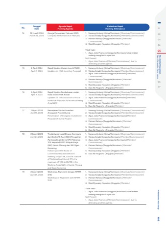 No. TanggalDateAgenda RapatMeeting AgendaKehadiran RapatMeeting Attendance14 14 Maret 2024March 14, 2024Kinerja Perusahaan Februari 2025Company Performance of February 20241. Nanang Untung (Ketua/Komisaris | Chairman/Commissioner)2. Tutuka Ariadji (Anggota/Komisaris | Member/Commissioner)3. Paiman Raharjo (Anggota/Komisaris | Member/Commissioner)4. Rizal Djunaidy Nasution (Anggota | Member) Tidak hadir1. Agus Joko Pramono (Anggota/Komisaris) dikarenakan sedang menghadiri rapat lainNot Present1. Agus Joko Pramono (Member/Commissioner) due to attending another agenda15 2 April 2024April 2, 2024Rapat Update Usulan Insentif NSO Updates on NSO Incentive Proposal1. Nanang Untung (Ketua/Komisaris | Chairman/Commissioner)2. Tutuka Ariadji (Anggota/Komisaris | Member/Commissioner)3. Agus Joko Pramono (Anggota/Komisaris | Member/Commissioner)4. Paiman Raharjo (Anggota/Komisaris | Member/Commissioner)5. Rizal Djunaidy Nasution (Anggota | Member) 6. Dwi Adi Nugroho (Anggota | Member)16 3 April 2024April 3, 2024Rapat Update Pembahasan usulan fiskal insentif WK RokanUpdates on the Discussion of Fiscal Incentive Proposals for Rokan Working Area (WK)1. Nanang Untung (Ketua/Komisaris | Chairman/Commissioner)2. Tutuka Ariadji (Anggota/Komisaris | Member/Commissioner)3. Agus Joko Pramono (Anggota/Komisaris | Member/Commissioner)4. Rizal Djunaidy Nasution (Anggota | Member) 5. Dwi Adi Nugroho (Anggota | Member)17 19 April 2024April 19, 2024Pemaparan Usulan Investasi Anorganik Proyek DumaiPresentation of Inorganic Investment Proposal of Dumai Project1. Nanang Untung (Ketua/Komisaris | Chairman/Commissioner)2. Tutuka Ariadji (Anggota/Komisaris | Member/Commissioner)3. Agus Joko Pramono (Anggota/Komisaris | Member/Commissioner)4. Paiman Raharjo (Anggota/Komisaris | Member/Commissioner)5. Rizal Djunaidy Nasution (Anggota | Member) 6. Dwi Adi Nugroho (Anggota | Member)18 23 April 2024April 23, 2024Tindak lanjut rapat Dewan Komisaris dan Direksi 18 April 2024 Pengalihan Participating Interest (PI) Maksimal 10% kepada BUMD Wilayah Kerja (WK) Jambi Merang dan WK Ogan KomeringFollow-up on the Board of Commissioners and Directors%u2019 meeting of April 18, 2024 re. Transfer of Participating Interest (PI) of a maximum of 10% to BUMD in the Working Areas (WK) of Jambi Merang and Ogan Komering1. Nanang Untung (Ketua/Komisaris | Chairman/Commissioner)2. Tutuka Ariadji (Anggota/Komisaris | Member/Commissioner)3. Agus Joko Pramono (Anggota/Komisaris | Member/Commissioner)4. Paiman Raharjo (Anggota/Komisaris | Member/Commissioner)5. Rizal Djunaidy Nasution (Anggota | Member) 6. Dwi Adi Nugroho (Anggota | Member)19 25 April 2024April 25, 2024Workshop Alignment dengan KPIMR SHU Workshop of Alignment with KPIMR SHU1. Nanang Untung (Ketua/Komisaris | Chairman/Commissioner)2. Tutuka Ariadji (Anggota/Komisaris | Member/Commissioner)3. Paiman Raharjo (Anggota/Komisaris | Member/Commissioner)4. Rizal Djunaidy Nasution (Anggota | Member) Tidak hadir1. Agus Joko Pramono (Anggota/Komisaris) dikarenakan sedang menghadiri rapat lainNot Present1. Agus Joko Pramono (Member/Commissioner) due to attending another agenda0102030405 Good Corporate Governance Tata kelola Perusahaan0607 PT Pertamina Hulu Energi 489