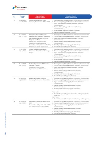 No. TanggalDateAgenda RapatMeeting AgendaKehadiran RapatMeeting Attendance31 25 Juni 2024June 25, 2024Kinerja Perusahaan Mei 2025Company Performance of May 20241. Nanang Untung (Ketua/Komisaris | Chairman/Commissioner)2. Tutuka Ariadji (Anggota/Komisaris | Member/Commissioner)3. Agus Joko Pramono (Anggota/Komisaris | Member/Commissioner)4. Paiman Raharjo (Anggota/Komisaris | Member/Commissioner)5. Rizal Djunaidy Nasution (Anggota | Member) 6. Dwi Adi Nugroho (Anggota | Member)32 27 Juni 2024June 27, 2024Pemaparan Rencana Kerja dan Realisasi Land Matters & Formalitiesdan Update Organisasi LMF SHU, Regional dan Zona%u201dPresentation of Work Plan and Realization of Land Matters & Formalities and Updates on LMF SHU, Regions, and Zones Organization1. Nanang Untung (Ketua/Komisaris | Chairman/Commissioner)2. Tutuka Ariadji (Anggota/Komisaris | Member/Commissioner)3. Agus Joko Pramono (Anggota/Komisaris | Member/Commissioner)4. Paiman Raharjo (Anggota/Komisaris | Member/Commissioner)5. Rizal Djunaidy Nasution (Anggota | Member) 6. Dwi Adi Nugroho (Anggota | Member)33 5 Juli 2024July 5, 2024Diskusi Update Proyek LangsaDiscussion of Updates on the Langsa Project1. Nanang Untung (Ketua/Komisaris | Chairman/Commissioner)2. Tutuka Ariadji (Anggota/Komisaris | Member/Commissioner)3. Agus Joko Pramono (Anggota/Komisaris | Member/Commissioner)4. Paiman Raharjo (Anggota/Komisaris | Member/Commissioner)5. Rizal Djunaidy Nasution (Anggota | Member) 6. Dwi Adi Nugroho (Anggota | Member)34 11 Juli 2024July 11, 2024Evaluasi Operatorship WK Corridor oleh PHE CorridorEvaluation of WK Corridor Operatorship by PHE Corridor1. Nanang Untung (Ketua/Komisaris | Chairman/Commissioner)2. Tutuka Ariadji (Anggota/Komisaris | Member/Commissioner)3. Agus Joko Pramono (Anggota/Komisaris | Member/Commissioner)4. Paiman Raharjo (Anggota/Komisaris | Member/Commissioner)5. Rizal Djunaidy Nasution (Anggota | Member) 6. Dwi Adi Nugroho (Anggota | Member)35 25 Juli 2024July 25, 2024Kinerja Perusahaan Juni 2025Company Performance of June 20241. Nanang Untung (Ketua/Komisaris | Chairman/Commissioner)2. Tutuka Ariadji (Anggota/Komisaris | Member/Commissioner)3. Agus Joko Pramono (Anggota/Komisaris | Member/Commissioner)4. Paiman Raharjo (Anggota/Komisaris | Member/Commissioner)5. Rizal Djunaidy Nasution (Anggota | Member) Tidak hadir1. Dwi Adi Nugroho (Anggota) dikarenakan sedang menghadiri rapat lainNot Present1. Dwi Adi Nugroho (Member) due to attending another agenda36 31 Juli 2024July 31, 2024Pemaparan Toprisk SHU RKAP tahun 2025 Presentation of Top Risks of the 2025 SHU Work Plan and Budget (RKAP)1. Nanang Untung (Ketua/Komisaris | Chairman/Commissioner)2. Tutuka Ariadji (Anggota/Komisaris | Member/Commissioner)3. Agus Joko Pramono (Anggota/Komisaris | Member/Commissioner)4. Paiman Raharjo (Anggota/Komisaris | Member/Commissioner)5. Rizal Djunaidy Nasution (Anggota | Member) 6. Dwi Adi Nugroho (Anggota | Member) Laporan Tahunan %u2022 Annual Report 492HULU ENERGI