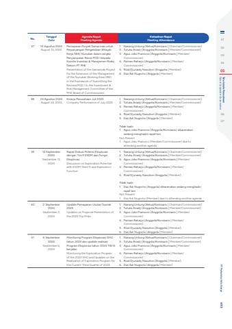 No. TanggalDateAgenda RapatMeeting AgendaKehadiran RapatMeeting Attendance37 14 Agustus 2024August 14, 2024Pemaparan Proyek Samarinda untuk Perpanjangan Pengelolaan Wilayah Kerja (WK) Nunukan dalam rangka Penyampaian Revisi POD I kepada Komite Investasi & Manajemen Risiko Dekom PT PHEPresentation of the Samarinda Project for the Extension of the Management of the Nunukan Working Area (WK) in the Framework of Submitting the Revised POD I to the Investment & Risk Management Committee of the PHE Board of Commissioners1. Nanang Untung (Ketua/Komisaris | Chairman/Commissioner)2. Tutuka Ariadji (Anggota/Komisaris | Member/Commissioner)3. Agus Joko Pramono (Anggota/Komisaris | Member/Commissioner)4. Paiman Raharjo (Anggota/Komisaris | Member/Commissioner)5. Rizal Djunaidy Nasution (Anggota | Member) 6. Dwi Adi Nugroho (Anggota | Member)38 23 Agustus 2024August 23, 2024Kinerja Perusahaan Juli 2025Company Performance of July 20251. Nanang Untung (Ketua/Komisaris | Chairman/Commissioner)2. Tutuka Ariadji (Anggota/Komisaris | Member/Commissioner)3. Paiman Raharjo (Anggota/Komisaris | Member/Commissioner)4. Rizal Djunaidy Nasution (Anggota | Member) 5. Dwi Adi Nugroho (Anggota | Member)Tidak hadir1. Agus Joko Pramono (Anggota/Komisaris) dikarenakan sedang menghadiri rapat lain Not Present1. Agus Joko Pramono (Member/Commissioner) due to attending another agenda39 12 September 2024September 12, 2024Rapat Diskusi Potensi Eksplorasi dengan Tim 9 ESDM dan Fungsi Eksplorasi Discussion on Exploration Potential with ESDM Team 9 and Exploration Function1. Nanang Untung (Ketua/Komisaris | Chairman/Commissioner)2. Tutuka Ariadji (Anggota/Komisaris | Member/Commissioner)3. Agus Joko Pramono (Anggota/Komisaris | Member/Commissioner)4. Paiman Raharjo (Anggota/Komisaris | Member/Commissioner)5. Rizal Djunaidy Nasution (Anggota | Member) Tidak hadir1. Dwi Adi Nugroho (Anggota) dikarenakan sedang menghadiri rapat lainNot Present1. Dwi Adi Nugroho (Member) due to attending another agenda40 2 September 2024September 2, 2024Update Pemaparan Usulan Toprisk 2025 Updates on Proposal Presentation of the 2025 Top Risks 1. Nanang Untung (Ketua/Komisaris | Chairman/Commissioner)2. Tutuka Ariadji (Anggota/Komisaris | Member/Commissioner)3. Agus Joko Pramono (Anggota/Komisaris | Member/Commissioner)4. Paiman Raharjo (Anggota/Komisaris | Member/Commissioner)5. Rizal Djunaidy Nasution (Anggota | Member) 6. Dwi Adi Nugroho (Anggota | Member)41 6 September 2024September 6, 2024Monitoring Program Eksplorasi SHU tahun 2023 dan update realisasi Program Eksplorasi tahun 2024 TW III berjalan Monitoring the Exploration Program of the 2023 SHU and Updates on the Realization of Exploration Program for the Current Third Quarter of 2024 1. Nanang Untung (Ketua/Komisaris | Chairman/Commissioner)2. Tutuka Ariadji (Anggota/Komisaris | Member/Commissioner)3. Agus Joko Pramono (Anggota/Komisaris | Member/Commissioner)4. Paiman Raharjo (Anggota/Komisaris | Member/Commissioner)5. Rizal Djunaidy Nasution (Anggota | Member) 6. Dwi Adi Nugroho (Anggota | Member)0102030405 Good Corporate Governance Tata kelola Perusahaan0607 PT Pertamina Hulu Energi 493