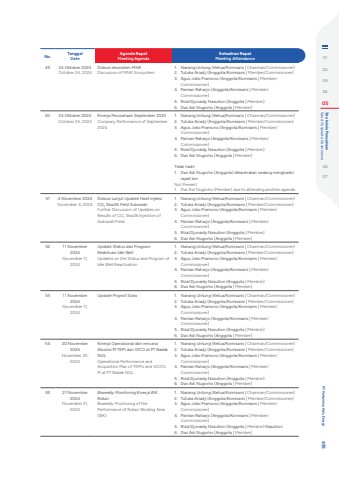 No. TanggalDateAgenda RapatMeeting AgendaKehadiran RapatMeeting Attendance49 24 Oktober 2024October 24, 2024Diskusi ekosistem MNK Discussion of MNK Ecosystem1. Nanang Untung (Ketua/Komisaris | Chairman/Commissioner)2. Tutuka Ariadji (Anggota/Komisaris | Member/Commissioner)3. Agus Joko Pramono (Anggota/Komisaris | Member/Commissioner)4. Paiman Raharjo (Anggota/Komisaris | Member/Commissioner)5. Rizal Djunaidy Nasution (Anggota | Member) 6. Dwi Adi Nugroho (Anggota | Member)50 24 Oktober 2024October 24, 2024Kinerja Perusahaan September 2025Company Performance of September 20241. Nanang Untung (Ketua/Komisaris | Chairman/Commissioner)2. Tutuka Ariadji (Anggota/Komisaris | Member/Commissioner)3. Agus Joko Pramono (Anggota/Komisaris | Member/Commissioner)4. Paiman Raharjo (Anggota/Komisaris | Member/Commissioner)5. Rizal Djunaidy Nasution (Anggota | Member) 6. Dwi Adi Nugroho (Anggota | Member)Tidak hadir1. Dwi Adi Nugroho (Anggota) dikarenakan sedang menghadiri rapat lainNot Present1. Dwi Adi Nugroho (Member) due to attending another agenda51 4 November 2024November 4, 2024Diskusi Lanjut Update Hasil Injeksi CO2 Skw26 Field SukowatiFurther Discussion of Updates on Results of CO2 Skw26 Injection of Sukowati Field1. Nanang Untung (Ketua/Komisaris | Chairman/Commissioner)2. Tutuka Ariadji (Anggota/Komisaris | Member/Commissioner)3. Agus Joko Pramono (Anggota/Komisaris | Member/Commissioner)4. Paiman Raharjo (Anggota/Komisaris | Member/Commissioner)5. Rizal Djunaidy Nasution (Anggota | Member) 6. Dwi Adi Nugroho (Anggota | Member)52 11 November 2024November 11, 2024Update Status dan Program Reaktivasi Idle WellUpdates on the Status and Program of Idle Well Reactivation1. Nanang Untung (Ketua/Komisaris | Chairman/Commissioner)2. Tutuka Ariadji (Anggota/Komisaris | Member/Commissioner)3. Agus Joko Pramono (Anggota/Komisaris | Member/Commissioner)4. Paiman Raharjo (Anggota/Komisaris | Member/Commissioner)5. Rizal Djunaidy Nasution (Anggota | Member) 6. Dwi Adi Nugroho (Anggota | Member)53 11 November 2024November 11, 2024Update Project Soka 1. Nanang Untung (Ketua/Komisaris | Chairman/Commissioner)2. Tutuka Ariadji (Anggota/Komisaris | Member/Commissioner)3. Agus Joko Pramono (Anggota/Komisaris | Member/Commissioner)4. Paiman Raharjo (Anggota/Komisaris | Member/Commissioner)5. Rizal Djunaidy Nasution (Anggota | Member) 6. Dwi Adi Nugroho (Anggota | Member)54 20 November 2024November 20, 2024Kinerja Operasional dan rencana Akuisisi PI TEPI dan VICO di PT Badak NGLOperational Performance and Acquisition Plan of TEPI%u2019s and VICO%u2019s PI at PT Badak NGL1. Nanang Untung (Ketua/Komisaris | Chairman/Commissioner)2. Tutuka Ariadji (Anggota/Komisaris | Member/Commissioner)3. Agus Joko Pramono (Anggota/Komisaris | Member/Commissioner)4. Paiman Raharjo (Anggota/Komisaris | Member/Commissioner)5. Rizal Djunaidy Nasution (Anggota | Member) 6. Dwi Adi Nugroho (Anggota | Member)55 21 November 2024November 21, 2024Biweekly Monitoring Kinerja WK Rokan Biweekly Monitoring of the Performance of Rokan Working Area (WK)1. Nanang Untung (Ketua/Komisaris | Chairman/Commissioner)2. Tutuka Ariadji (Anggota/Komisaris | Member/Commissioner)3. Agus Joko Pramono (Anggota/Komisaris | Member/Commissioner)4. Paiman Raharjo (Anggota/Komisaris | Member/Commissioner)5. Rizal Djunaidy Nasution (Anggota | Member) Nasution6. Dwi Adi Nugroho (Anggota | Member)0102030405 Good Corporate Governance Tata kelola Perusahaan0607 PT Pertamina Hulu Energi 495
