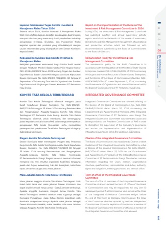 Laporan Pelaksanaan Tugas Komite Investasi & Manajemen Risiko Tahun 2024Selama tahun 2024, Komite Investasi & Manajemen Risiko telah menerbitkan laporan kegiatan pengawasan baik triwulan maupun tahunan yang mencakup hasil penelaahan terhadap pengelolaan Investasi, Divestasi, dan Manajemen Risiko kegiatan operasi dan produksi yang ditindaklanjuti dengan usulan rekomendasi yang disampaikan oleh Dewan Komisaris kepada Direksi. Kebijakan Remunerasi bagi Komite Investasi & Manajemen Risiko Kebijakan pemberian remunerasi bagi Komite Audit sesuai dengan Peraturan Menteri Badan Usaha Milik Negara Nomor PER-3/MBU/03/2023 Tahun 2023 tentang Organ dan Sumber Daya Manusia Badan Usaha Milik Negara dan Surat Keputusan Dewan Komisaris No. Kpts-012/DK-PHE/2024-S0 tanggal 2 September 2024 tentang Tata Kelola Organisasi dan Sumber Daya Manusia di Lingkungan Dewan Komisaris PT Pertamina Hulu Energi.KOMITE TATA KELOLA TERINTEGRASIKomite Tata Kelola Terintegrasi dibentuk mengacu pada Surat Keputusan Dewan Komisaris No. Kpts-006/DKPHE/2024-S0 tanggal 25 Maret 2024 tentang Pembentukan dan Pengangkatan Anggota-Anggota Komite Tata Kelola Terintegrasi PT Pertamina Hulu Energi. Komite Tata Kelola Terintegrasi dibentuk untuk membantu dan bertanggung jawab kepada Komisaris Utama PHE dalam rangka memperkuat pengawasan tata kelola Perusahaan serta memastikan penerapan dan pelaksanaan Tata Kelola Terintegrasi di lingkup Subholding Upstream. Piagam Komite Tata Kelola TerintegrasiDewan Komisaris telah menetapkan Piagam atau Pedoman Kerja Komite Tata Kelola Terintegrasi melalui Surat Keputusan Dewan Komisaris No. Kpts-006/DK-PHE/2024-S0 tanggal 25 Maret 2024 tentang Pembentukan dan Pengangkatan Anggota-Anggota Komite Tata Kelola Terintegrasi PT Pertamina Hulu Energi. Piagam tersebut memuat informasi mengenai visi, misi, struktur organisasi, kualifikasi, tanggung jawab dan tugas, wewenang, hak dan kewajiban, ketentuan rapat, serta masa tugas atau masa jabatan. Masa Jabatan Komite Tata Kelola TerintegrasiMasa jabatan anggota Komite Tata Kelola Terintegrasi tidak boleh lebih lama dari masa jabatan Dewan Komisaris dan dapat dipilih kembali hanya untuk 1 (satu) periode berikutnya. Apabila anggota Komisaris menjadi Ketua Komite Tata Kelola Terintegrasi berhenti sebelum masa tugasnya sebagai Komisaris Perusahaan, maka Ketua Komite digantikan oleh Komisaris Independen lainnya. Apabila masa jabatan sebagai Dewan Komisaris berakhir, maka berakhir pula masa Jabatan sebagai Anggota Komite Tata Kelola Terintegrasi. Report on the Implementation of the Duties of the Investment & Risk Management Committee in 2024During 2024, the Investment & Risk Management Committee has published quarterly and annual supervisory activity reports which include the results of the review of Investment, Divestment, and Risk Management management of operational and production activities which are followed up with recommendations submitted by the Board of Commissioners to the Board of Directors.Remuneration Policy for Investment & Risk Management CommitteeThe remuneration policy for the Audit Committee is In accordance with the Regulation of the Minister of State-Owned Enterprises Number PER-3/MBU/03/2023 of 2023 concerning the Organs and Human Resources of State-Owned Enterprises, and the Decree of the Board of Commissioners Number Kpts012/DK-PHE/2024-S0 dated September 2, 2024, concerning the Governance of Organization and Human Resources within the Board of Commissioners of PT Pertamina Hulu Energi.INTEGRATED GOVERNANCE COMMITTEEIntegrated Governance Committee was formed referring to the Decree of the Board of Commissioners No. Kpts-006/DK-PHE/2024-S0 dated March 25, 2024 concerning the Establishment and Appointment of Members of the Integrated Governance Committee of PT Pertamina Hulu Energi. The Integrated Governance Committee was formed to assist and be responsible to the President Commissioner of PHE in order to strengthen the supervision of the Company's governance and ensure the implementation and implementation of Integrated Governance within the Upstream Subholding.Charter of the Integrated Governance Committee The Board of Commissioners has established a Charter or Work Guidelines of the Integrated Governance Committee by virtue of Decree of the Board of Commissioners No. Kpts-006/DKPHE/2024-S0 dated March 25, 2024 on the Establishment and Appointment of Members of the Integrated Governance Committee of PT Pertamina Hulu Energi. The charter contains information regarding the vision, mission, organizational structure, qualifications, responsibilities and duties, authority, rights and obligations, meeting provisions, and term of office. Term of office of the Integrated Governance CommitteeThe term of office of members of the Integrated Governance Committee shall not exceed the term of office of the Board of Commissioners and may be reappointed for only one (1) subsequent period. If a Commissioner who serves as the Chair of the Integrated Governance Committee resigns before the end of their term as Company Commissioner, the Chair of the Committee shall be replaced by another Independent Commissioner. Upon the expiration of the term as a member of the Board of Commissioners, the term of office as a member of the Integrated Governance Committee shall also end.0102030405 Good Corporate Governance Tata kelola Perusahaan0607 PT Pertamina Hulu Energi 497