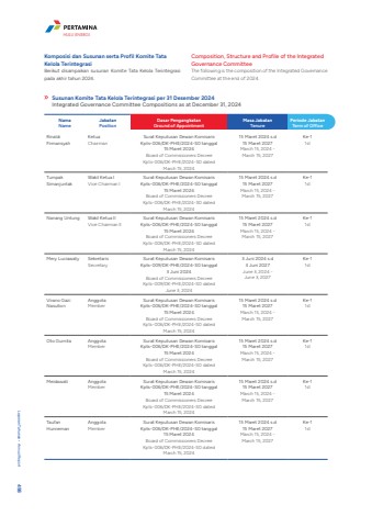 Komposisi dan Susunan serta Profil Komite Tata Kelola TerintegrasiBerikut disampaikan susunan Komite Tata Kelola Terintegrasi pada akhir tahun 2024.Composition, Structure and Profile of the Integrated Governance CommitteeThe following is the composition of the Integrated Governance Committee at the end of 2024.Susunan Komite Tata Kelola Terintegrasi per 31 Desember 2024Integrated Governance Committee Compositions as at December 31, 2024NamaNameJabatanPositionDasar PengangkatanGround of AppointmentMasa JabatanTenurePeriode JabatanTerm of OfficeRinaldi FirmansyahKetuaChairmanSurat Keputusan Dewan Komisaris Kpts-006/DK-PHE/2024-S0 tanggal 15 Maret 2024 Board of Commissioners DecreeKpts-006/DK-PHE/2024-S0 dated March 15, 202415 Maret 2024 s.d15 Maret 2027March 15, 2024 - March 15, 2027Ke-11stTumpak SimanjuntakWakil Ketua IVice Chairman ISurat Keputusan Dewan Komisaris Kpts-006/DK-PHE/2024-S0 tanggal 15 Maret 2024 Board of Commissioners DecreeKpts-006/DK-PHE/2024-S0 dated March 15, 202415 Maret 2024 s.d15 Maret 2027March 15, 2024 - March 15, 2027Ke-11stNanang Untung Wakil Ketua IIVice Chairman IISurat Keputusan Dewan Komisaris Kpts-006/DK-PHE/2024-S0 tanggal 15 Maret 2024 Board of Commissioners DecreeKpts-006/DK-PHE/2024-S0 dated March 15, 202415 Maret 2024 s.d15 Maret 2027March 15, 2024 - March 15, 2027Ke-11stMery Luciawaty SekretarisSecretarySurat Keputusan Dewan Komisaris Kpts-009/DK-PHE/2024-S0 tanggal 3 Juni 2024Board of Commissioners DecreeKpts-009/DK-PHE/2024-S0 dated June 3, 20243 Juni 2024 s.d 3 Juni 2027June 3, 2024 - June 3, 2027Ke-11stVirano Gazi NasutionAnggotaMemberSurat Keputusan Dewan Komisaris Kpts-006/DK-PHE/2024-S0 tanggal 15 Maret 2024 Board of Commissioners DecreeKpts-006/DK-PHE/2024-S0 dated March 15, 202415 Maret 2024 s.d15 Maret 2027March 15, 2024 - March 15, 2027Ke-11stOto Gurnita AnggotaMemberSurat Keputusan Dewan Komisaris Kpts-006/DK-PHE/2024-S0 tanggal 15 Maret 2024 Board of Commissioners DecreeKpts-006/DK-PHE/2024-S0 dated March 15, 202415 Maret 2024 s.d15 Maret 2027March 15, 2024 - March 15, 2027Ke-11stMeidawati AnggotaMemberSurat Keputusan Dewan Komisaris Kpts-006/DK-PHE/2024-S0 tanggal 15 Maret 2024 Board of Commissioners DecreeKpts-006/DK-PHE/2024-S0 dated March 15, 202415 Maret 2024 s.d15 Maret 2027March 15, 2024 - March 15, 2027Ke-11stTaufan HunnemanAnggotaMemberSurat Keputusan Dewan Komisaris Kpts-006/DK-PHE/2024-S0 tanggal 15 Maret 2024 Board of Commissioners DecreeKpts-006/DK-PHE/2024-S0 dated March 15, 202415 Maret 2024 s.d15 Maret 2027March 15, 2024 - March 15, 2027Ke-11st Laporan Tahunan %u2022 Annual Report 498HULU ENERGI
