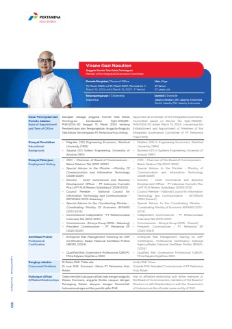 Dasar Penunjukan dan Periode JabatanBasis of Appointment and Term of OfficeDiangkat sebagai anggota Komite Tata Kelola Terintegrasi berdasarkan Kpts-006/DKPHE/2024-S0 tanggal 15 Maret 2024 tentang Pembentukan dan Pengangkatan Anggota-Anggota Tata Kelola Terintergarasi PT Pertamina Hulu Energi.Appointed as a member of the Integrated Governance Committee based on Decree No. Kpts-006/DKPHE/2024-S0 dated March 15, 2024, concerning the Establishment and Appointment of Members of the Integrated Governance Committee of PT Pertamina Hulu Energi.Riwayat PendidikanEducational Background%u2022 Magister (S2) Engineering Economic, Stanford University (1993)%u2022 Sarjana (S1) Sistem Engineering, University of Arizona (1991)%u2022 Masters (S2) in Engineering Economics, Stanford University (1993)%u2022 Bachelor (S1) in Systems Engineering, University of Arizona (1991)Riwayat PekerjaanEmployment History%u2022 CEO %u2013 Chairman of Board of Commissioners - Bakrie Telekom Tbk (2001-2005)%u2022 Special Advisor to the Minister %u2013-Ministry Of Communication and Information Technology(2008-2009)%u2022 Director - Chief Commercial and Business Development Officer - PT Indonesia Comnets Plus (a PT PLN Persero Subsidiary) (2009-2012)%u2022 Council Member - National Council for Information Technology and Communication - DETIKNAS (2013-Sekarang)%u2022 Special Advisor to the Coordinating Minister - Coordinating Ministry Of Economic AFFAIRS (2012-2014)%u2022 Commissioner Independent - PT Telekomunikasi Indonesia Tbk (2012-2015)%u2022 Commissioner - Ativirya Group (2016 %u2013 Sekarang)%u2022 President Commissioner - PT Pertamina EP (2020-2023)%u2022 CEO %u2013 Chairman of the Board of Commissioners - Bakrie Telekom Tbk (2001-2005)%u2022 Special Advisor to the Minister - Ministry of Communication and Information Technology (2008-2009)%u2022 Director - Chief Commercial and Business Development Officer - PT Indonesia Comnets Plus (a PT PLN Persero Subsidiary) (2009-2012)%u2022 Council Member - National Council for Information Technology and Communication - DETIKNAS (2013-Present)%u2022 Special Advisor to the Coordinating Minister - Coordinating Ministry of Economic AFFAIRS (2012-2014)%u2022 Independent Commissioner - PT Telekomunikasi Indonesia Tbk (2012-2015)%u2022 Commissioner - Ativirya Group (2016 - Present)%u2022 President Commissioner - PT Pertamina EP (2020-2023)Sertifikasi ProfesiProfessional Certification%u2022 Entreprise Risk Management Tranining for CRP Certification, Badan Nasional Sertifikasi Profesi (BNSP), (2024)%u2022 Qualified Risk Governance Professional (QRGP), Mitra Kalyana Sejahtera, 2023%u2022 Enterprise Risk Management Training for CRP Certification, Professional Certification National Agency/Badan Nasional Sertifikasi Profesi (BNSP), (2024)%u2022 Qualified Risk Governance Professional (QRGP), Mitra Kalyana Sejahtera, 2023Rangkap JabatanConcurrent PositionsDi Dalam PHE: Tidak adaDi Luar PHE: Komisaris Utama PT Pertamina Hulu RokanInside PHE: NoneOutside PHE: President Commissioner of PT Pertamina Hulu RokanHubungan AfiliasiAffiliated RelationshipsTidak memiliki hubungan afiliasi baik dengan anggota Dewan Komisaris, anggota Direksi maupun dengan Pemegang Saham ataupun dengan Pemerintah Indonesia sebagai entitas pemilik akhir PHE.Has no affiliated relationship with either members of the Board of Commissioners, members of the Board of Directors or with Shareholders or with the Government of Indonesia as the ultimate owner entity of PHE.Virano Gazi Nasution Anggota Komite Tata Kelola TerintegrasiMember of the Integrated Governance CommitteePeriode Menjabat / Terms of Office Usia / Age15 Maret 2024 s.d 15 Maret 2027, Periode ke-1March 15, 2024 until March 15, 2027, 1st Period57 tahun57 years oldKewarganegaraan / Citizenship Domisili / DomicileIndonesia Jakarta Selatan, DKI Jakarta, IndonesiaSouth Jakarta, DKI Jakarta, IndonesiaLaporan Tahunan %u2022 Annual Report 500HULU ENERGI