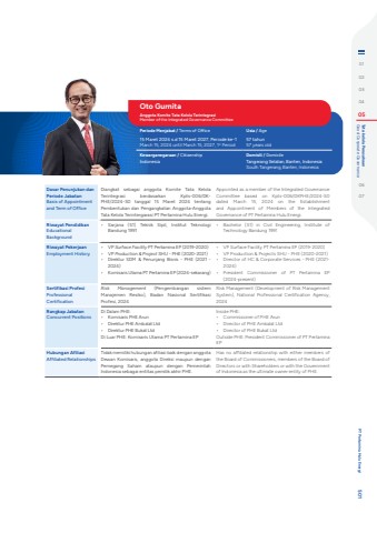 Dasar Penunjukan dan Periode JabatanBasis of Appointment and Term of OfficeDiangkat sebagai anggota Komite Tata Kelola Terintegrasi berdasarkan Kpts-006/DKPHE/2024-S0 tanggal 15 Maret 2024 tentang Pembentukan dan Pengangkatan Anggota-Anggota Tata Kelola Terintergarasi PT Pertamina Hulu Energi. Appointed as a member of the Integrated Governance Committee based on Kpts-006/DKPHE/2024-S0 dated March 15, 2024 on the Establishment and Appointment of Members of the Integrated Governance of PT Pertamina Hulu Energi.Riwayat PendidikanEducational Background%u2022 Sarjana (S1) Teknik Sipil, Institut Teknologi Bandung 1991%u2022 Bachelor (S1) in Civil Engineering, Institute of Technology Bandung 1991Riwayat PekerjaanEmployment History%u2022 VP Surface Facility PT Pertamina EP (2019-2020)%u2022 VP Production & Project SHU - PHE (2020-2021)%u2022 Direktur SDM & Penunjang Bisnis - PHE (2021 - 2024)%u2022 Komisaris Utama PT Pertamina EP (2024-sekarang)%u2022 VP Surface Facility PT Pertamina EP (2019-2020)%u2022 VP Production & Projects SHU - PHE (2020-2021)%u2022 Director of HC & Corporate Services - PHE (2021-2024)%u2022 President Commissioner of PT Pertamina EP (2024-present)Sertifikasi ProfesiProfessional CertificationRisk Management (Pengembangan sistem Manajemen Resiko), Badan Nasional Sertifikasi Profesi, 2024Risk Management (Development of Risk Management System), National Professional Certification Agency, 2024Rangkap JabatanConcurrent PositionsDi Dalam PHE: %u2022 Komisaris PHE Arun%u2022 Direktur PHE Ambalat Ltd%u2022 Direktur PHE Bukat LtdDi Luar PHE: Komisaris Utama PT Pertamina EPInside PHE:%u2022 Commissioner of PHE Arun%u2022 Director of PHE Ambalat Ltd%u2022 Director of PHE Bukat LtdOutside PHE: President Commissioner of PT Pertamina EPHubungan AfiliasiAffiliated RelationshipsTidak memiliki hubungan afiliasi baik dengan anggota Dewan Komisaris, anggota Direksi maupun dengan Pemegang Saham ataupun dengan Pemerintah Indonesia sebagai entitas pemilik akhir PHE.Has no affiliated relationship with either members of the Board of Commissioners, members of the Board of Directors or with Shareholders or with the Government of Indonesia as the ultimate owner entity of PHE.Oto GurnitaAnggota Komite Tata Kelola TerintegrasiMember of the Integrated Governance CommitteePeriode Menjabat / Terms of Office Usia / Age15 Maret 2024 s.d 15 Maret 2027, Periode ke-1March 15, 2024 until March 15, 2027, 1st Period57 tahun57 years oldKewarganegaraan / Citizenship Domisili / DomicileIndonesia Tangerang Selatan, Banten, IndonesiaSouth Tangerang, Banten, Indonesia0102030405 Good Corporate Governance Tata kelola Perusahaan0607 PT Pertamina Hulu Energi 501