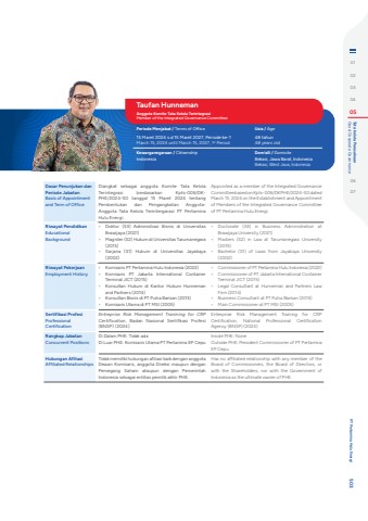 Dasar Penunjukan dan Periode JabatanBasis of Appointment and Term of OfficeDiangkat sebagai anggota Komite Tata Kelola Terintegrasi berdasarkan Kpts-006/DKPHE/2024-S0 tanggal 15 Maret 2024 tentang Pembentukan dan Pengangkatan AnggotaAnggota Tata Kelola Terintergarasi PT Pertamina Hulu Energi.Appointed as a member of the Integrated Governance Committee based on Kpts-006/DKPHE/2024-S0 dated March 15, 2024 on the Establishment and Appointment of Members of the Integrated Governance Committee of PT Pertamina Hulu Energi.Riwayat PendidikanEducational Background%u2022 Doktor (S3) Administrasi Bisnis di Universitas Brawijaya (2021)%u2022 Magister (S2) Hukum di Universitas Tarumanegara (2015)%u2022 Sarjana (S1) Hukum di Universitas Jayabaya (2002)%u2022 Doctorate (S3) in Business Administration at Brawijaya University (2021)%u2022 Masters (S2) in Law at Tarumanegara University (2015)%u2022 Bachelor (S1) of Laws from Jayabaya University (2002)Riwayat PekerjaanEmployment History%u2022 Komisaris PT Pertamina Hulu Indonesia (2022)%u2022 Komisaris PT Jakarta International Container Terminal JICT (2015)%u2022 Konsultan Hukum di Kantor Hukum Hunneman and Partners (2014)%u2022 Konsultan Bisnis di PT Putra Barisan (2013)%u2022 Komisaris Utama di PT MSI (2005)%u2022 Commissioner of PT Pertamina Hulu Indonesia (2022)%u2022 Commissioner of PT Jakarta International Container Terminal JICT (2015)%u2022 Legal Consultant at Hunneman and Partners Law Firm (2014)%u2022 Business Consultant at PT Putra Barisan (2013)%u2022 Main Commissioner at PT MSI (2005)Sertifikasi ProfesiProfessional CertificationEntreprise Risk Management Tranining for CRP Certification, Badan Nasional Sertifikasi Profesi (BNSP) (2024)Enterprise Risk Management Training for CRP Certification, National Professional Certification Agency (BNSP) (2024)Rangkap JabatanConcurrent PositionsDi Dalam PHE: Tidak adaDi Luar PHE: Komisaris Utama PT Pertamina EP CepuInside PHE: NoneOutside PHE: President Commissioner of PT Pertamina EP CepuHubungan AfiliasiAffiliated RelationshipsTidak memiliki hubungan afiliasi baik dengan anggota Dewan Komisaris, anggota Direksi maupun dengan Pemegang Saham ataupun dengan Pemerintah Indonesia sebagai entitas pemilik akhir PHE.Has no affiliated relationship with any member of the Board of Commissioners, the Board of Directors, or with the Shareholders, nor with the Government of Indonesia as the ultimate owner of PHE.Taufan Hunneman Anggota Komite Tata Kelola TerintegrasiMember of the Integrated Governance CommitteePeriode Menjabat / Terms of Office Usia / Age15 Maret 2024 s.d 15 Maret 2027, Periode ke-1March 15, 2024 until March 15, 2027, 1st Period48 tahun48 years oldKewarganegaraan / Citizenship Domisili / DomicileIndonesia Bekasi, Jawa Barat, IndonesiaBekasi, West Java, Indonesia0102030405 Good Corporate Governance Tata kelola Perusahaan0607 PT Pertamina Hulu Energi 503