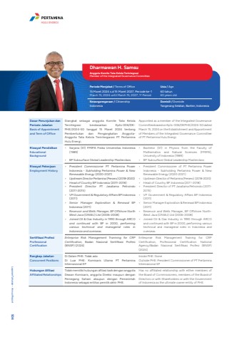 Dasar Penunjukan dan Periode JabatanBasis of Appointment and Term of OfficeDiangkat sebagai anggota Komite Tata Kelola Terintegrasi berdasarkan Kpts-006/DKPHE/2024-S0 tanggal 15 Maret 2024 tentang Pembentukan dan Pengangkatan AnggotaAnggota Tata Kelola Terintergarasi PT Pertamina Hulu Energi.Appointed as a member of the Integrated Governance Committee based on Kpts-006/DKPHE/2024-S0 dated March 15, 2024 on the Establishment and Appointment of Members of the Integrated Governance Committee of PT Pertamina Hulu Energi.Riwayat PendidikanEducational Background%u2022 Sarjana (S1) FMIPA Fisika Universitas Indonesia (1989)%u2022 BP Subsurface Global Leadership Masterclass%u2022 Bachelor (S1) in Physics from the Faculty of Mathematics and Natural Sciences (FMIPA), University of Indonesia (1989)%u2022 BP Subsurface Global Leadership MasterclassRiwayat PekerjaanEmployment History%u2022 President Commissioner PT Pertamina Power Indonesia - Subholding Pertamina Power & New Renewable Energy (2020-2021)%u2022 Upstream Director Pertamina (Persero) (2018-2020)%u2022 Head of Country BP Indonesia (2011-2018)%u2022 President Director PT Jasatama Petroindo (2011-2015)%u2022 VP Government & Regulatory Affairs BP Indonesia (2011)%u2022 Senior Manager Exploration & Renewal BP Indonesia (2011)%u2022 Reservoir and Wells Manager, BP Offshore North West Java (ONWJ) Ltd (2006-2008)%u2022 Joined Oil & Gas Industry in 1990 through ARCO and continued with BP in 2000, performing various technical and managerial roles in Indonesia and overseas.%u2022 President Commissioner of PT Pertamina Power Indonesia - Subholding Pertamina Power & New Renewable Energy (2020-2021)%u2022 Upstream Director of Pertamina (Persero) (2018-2020)%u2022 Head of Country BP Indonesia (2011-2018)%u2022 President Director of PT Jasatama Petroindo (2011- 2015)%u2022 VP Government & Regulatory Affairs BP Indonesia (2011)%u2022 Senior Manager Exploration & Renewal BP Indonesia (2011)%u2022 Reservoir and Wells Manager, BP Offshore NorthWest Java (ONWJ) Ltd (2006-2008)%u2022 Joined Oil & Gas Industry in 1990 through ARCO and continued with BP in 2000, performing various technical and managerial roles in Indonesia and overseas.Sertifikasi ProfesiProfessional CertificationEntreprise Risk Management Tranining for CRP Certification, Badan Nasional Sertifikasi Profesi (BNSP) (2024)Enterprise Risk Management Training for CRP Certification, Professional Certification National Agency/Badan Nasional Sertifikasi Profesi (BNSP) (2024)Rangkap JabatanConcurrent PositionsDi Dalam PHE: Tidak adaDi Luar PHE: Komisaris Utama PT Pertamina Internasional EPInside PHE: NoneOutside PHE: President Commissioner of PT Pertamina Internasional EPHubungan AfiliasiAffiliated RelationshipsTidak memiliki hubungan afiliasi baik dengan anggota Dewan Komisaris, anggota Direksi maupun dengan Pemegang Saham ataupun dengan Pemerintah Indonesia sebagai entitas pemilik akhir PHE.Has no affiliated relationship with either members of the Board of Commissioners, members of the Board of Directors or with Shareholders or with the Government of Indonesia as the ultimate owner entity of PHE.Dharmawan H. Samsu Anggota Komite Tata Kelola TerintegrasiMember of the Integrated Governance CommitteePeriode Menjabat / Terms of Office Usia / Age15 Maret 2024 s.d 15 Maret 2027, Periode ke-1March 15, 2024 until March 15, 2027, 1st Period60 tahun60 years oldKewarganegaraan / Citizenship Domisili / DomicileIndonesia Tangerang Selatan, Banten, IndonesiaLaporan Tahunan %u2022 Annual Report 504HULU ENERGI