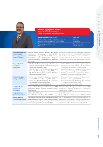 Dasar Penunjukan dan Periode JabatanBasis of Appointment and Term of OfficeDiangkat sebagai anggota Komite Tata Kelola Terintegrasi berdasarkan Kpts-006/DKPHE/2024-S0 tanggal 15 Maret 2024 tentang Pembentukan dan Pengangkatan AnggotaAnggota Tata Kelola Terintergarasi PT Pertamina Hulu Energi.Appointed as a member of the Integrated Governance Committee based on Kpts-006/DKPHE/2024-S0 dated March 15, 2024 on the Establishment and Appointment of Members of the Integrated Governance Committee of PT Pertamina Hulu Energi.Riwayat PendidikanEducational Background%u2022 S2 Teknik Mesin, University of Indonesia (Indonesia) linked with Queensland University of Technology (Australia), (1998)%u2022 Diploma Engineering Management, Queensland University of Technology (Australia), (1997),%u2022 S1 Teknik Perminyakan, Institut Teknologi Bandung (Indonesia), (1990)%u2022 Master of Mechanical Engineering, University of Indonesia (Indonesia) linked with Queensland University of Technology (Australia), (1998),%u2022 Diploma in Engineering Management, Queensland University of Technology (Australia), (1997),%u2022 Bachelor of Petroleum Engineering, Bandung Institute of Technology (Indonesia), (1990)Riwayat PekerjaanEmployment History%u2022 Senior Vice President Corporate Strategic Growth, PT Pertamina (Persero), (2017-2018)%u2022 Senior Vice President Strategy & Investment, PT Pertamina (Persero) (2018-2023)%u2022 Director Maurel & Prom, (2020-2024)%u2022 Senior Vice President Corporate Strategic Growth, PT Pertamina (Persero), (2017-2018)%u2022 Senior Vice President of Strategy & Investment, PT Pertamina (Persero) (2018-2023)%u2022 Director Maurel & Prom, (2020-2024)Sertifikasi ProfesiProfessional CertificationEntreprise Risk Management Tranining for CRP Certification, Badan Nasional Sertifikasi Profesi (BNSP) (2024)Enterprise Risk Management Training for CRP Certification, National Professional Certification Agency (BNSP) (2024)Rangkap JabatanConcurrent PositionsDi Dalam PHE: Tidak adaDi Luar PHE: Komisaris Utama PT Badak NGLInside PHE: NoneOutside PHE: President Commissioner of PT Badak NGLHubungan AfiliasiAffiliated RelationshipsTidak memiliki hubungan afiliasi baik dengan anggota Dewan Komisaris, anggota Direksi maupun dengan Pemegang Saham ataupun dengan Pemerintah Indonesia sebagai entitas pemilik akhir PHE.Has no affiliated relationship with either members of the Board of Commissioners, members of the Board of Directors or with Shareholders or with the Government of Indonesia as the ultimate owner entity of PHE.Daniel Syahputra Purba Anggota Komite Tata Kelola TerintegrasiMember of the Integrated Governance CommitteePeriode Menjabat / Terms of Office Usia / Age15 Maret 2024 s.d 15 Maret 2027, Periode ke-1March 15, 2024 until March 15, 2027, 1st Period57 tahun57 years oldKewarganegaraan / Citizenship Domisili / DomicileIndonesia Jakarta, Indonesia0102030405 Good Corporate Governance Tata kelola Perusahaan0607 PT Pertamina Hulu Energi 507