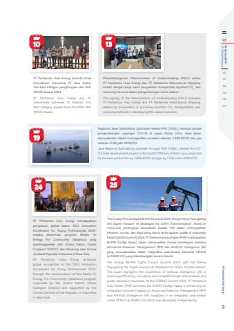 SEP10SEP19SEP13Regional Jawa Subholding Upstream melalui PHE ONWJ, memulai proyek pengembangan Lapangan OO-OX di Lepas Pantai Utara Jawa Barat, diproyeksikan dapat meningkatkan produksi sebesar 2.996 BOPD dan gas sebesar 21,26 juta MMSCFD.Java Regional Subholding Upstream through PHE ONWJ, started the OOOX Field development project in the North Offshore of West Java, projected to increase production by 2,996 BOPD and gas by 21.26 million MMSCFD.PT Pertamina Hulu Energi beserta Anak Perusahaan menerima 12 (dua belas) The Best kategori penghargaan dari SKK MIGAS Award 2024.PT Pertamina Hulu Energi and its subsidiaries achieved 12 (twelve) The Best category awards from the 2024 SKK MIGAS Award.Penandatanganan Memorandum of Understanding (MoU) antara PT Pertamina Hulu Energi dan PT Pertamina International Shipping terkait dengan kerja sama penyediaan transportasi liquified CO2 dan receiving terminal dalam pengembangan bisnis karbon.The signing of the Memorandum of Understanding (MoU) between PT Pertamina Hulu Energi and PT Pertamina International Shipping related to cooperation in providing liquefied CO2 transportation and receiving terminals in developing the carbon business.The Fordigi (Forum Digital BUMN) Summit 2024, dengan tema \the Digital Horizon: AI Strategies for SOE%u2019s Transformation\menyoroti pentingnya kecerdasan buatan (AI) dalam meningkatkan efisiensi, inovasi, dan daya saing bisnis serta layanan publik di Indonesia. Pada FORDIGI Summit 2024, PT Pertamina Hulu Rokan (PHR) mendapatkan BUMN Fordigi Award dalam menampilkan Inovasi terintegrasi berbasis Advanced Reservoir Management (RM) dan Artificial Intelligence (AI) yang divisualisasikan dalam integrated web-based, bernama VENUS (e-MARS 2.0) yang dikembangkan secara mandiri.The Fordigi (BUMN Digital Forum) Summit 2024, with the theme \This event highlights the importance of artificial intelligence (AI) in improving efficiency, innovation, and competitiveness of businesses and public services in Indonesia. At the FORDIGI Summit 2024, PT Pertamina Hulu Rokan (PHR) achieved the BUMN Fordigi Award in presenting an integrated Innovation based on Advanced Reservoir Management (RM) and Artificial Intelligence (AI) visualized in an integrated web-based, called VENUS (e-MARS 2.0) which was developed independently.PT Pertamina Hulu Energi mendapatkan pengakuan global dalam %u2018SDG Innovation Accelerator for Young Professionals 2024%u2019 melalui diseminasi program Waste To Energy For Community (Wasteco) yang diselenggarakan oleh United Nation Global Compact (UNGC) dan didukung oleh Konsul Jenderal Republik Indonesia di New York.PT Pertamina Hulu Energi achieved global recognition in the 'SDG Innovation Accelerator for Young Professionals 2024' through the dissemination of the Waste To Energy For Community (Wasteco) program organized by the United Nation Global Compact (UNGC) and supported by the Consul General of the Republic of Indonesia in New York.SEP24SEP2501 2024 Performance Performa 2024020304050607Laporan Tahunan %u2022 Annual Report 48PT Pertamina Hulu Energi 49
