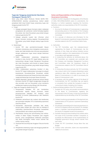 Tugas dan Tanggung Jawab Komite Tata Kelola Terintegrasi (\Selain yang diatur dalam Peraturan Menteri BUMN PER2/MBU/03/2023 dan/atau perubahannya, berikut adalah penjabaran lebih lanjut terkait fungsi, wewenang, tugas, dan tanggung jawab Komite TKT:a. Fungsi1. Sebagai perangkat Dewan Komisaris dalam melakukan pengawasan dan pemberian nasihat terhadap kegiatan Perusahaan dan Anak Perusahaan yang terkait dengan bidang tugas Komite TKT.2. Sebagai penyedia rujukan dan informasi untuk Dewan Komisaris tentang kegiatan Perusahaan/Anak Perusahaan yang terkait dengan bidang tugas Komite TKT. b. Kewenangan1. Komite TKT, atas perintah/izin/mewakili Dewan Komisaris, berwenang untuk mengakses secara penuh, bebas, dan tidak terbatas atas informasi yang berkaitan dengan pelaksanaan tugas sesuai dengan ketentuan yang berlaku. 2. Dalam melaksanakan wewenang sebagaimana tersebut di atas, Komite TKT dapat bekerja sama dan berkoordinasi dengan Fungsi Manajemen Perusahaan dan Anak Perusahaan serta Komite di bawah Dewan Komisaris Anak Perusahaan yang terkait dengan bidang tugas Komite TKT. 3. Dalam melaksanakan wewenang tersebut di atas, Komite TKT dapat melaksanakan kunjungan ke wilayah kerja/operasi Perusahaan/Anak Perusahaan setelah mendapat persetujuan dari Dewan Komisaris atau dalam rangka pendampingan kunjungan Dewan Komisaris. 4. Apabila diperlukan, dengan persetujuan tertulis Dewan Komisaris, Komite TKT dapat menggunakan tenaga ahli atau konsultan dari luar Perusahaan untuk membantu pelaksanaan tugasnya yang dibiayai oleh Perusahaan. c. Tugas dan Tanggung Jawab Komite TKT1. Mengevaluasi kebijakan TKT dan memberikan rekomendasi kepada Dewan Komisaris terkait penyempurnaan kebijakan TKT tersebut, untuk kemudian di-monitor pelaksanaannya oleh Sekretaris Komite TKT.2. Melakukan pemantauan dan evaluasi atas keselarasan dan penerapan kebijakan TKT di Subholding Upstream/Anak Perusahaan.3. Memberikan rekomendasi perbaikan tata kelola, berupa upaya mitigasi dan solusi, atas isu strategis di Subholding Upstream/Anak Perusahaan berdasarkan hasil penelaahan dan evaluasi yang terintegrasi.4. Memfasilitasi sharing dan benchmarking dari entitasentitas di dalam lingkup Perusahaan para anggota Komite, untuk mengakselerasi efektivitas penerapan tata kelola terintegrasi melalui lesson learned dari entitas masing-masing. 5. Membuat Rencana Kerja dan Anggaran Tahunan Komite TKT.6. Menjalankan wewenang, tugas, dan tanggung jawab lain yang terkait dengan fungsinya. Duties and Responsibilities of the Integrated Governance CommitteeIn addition to what is regulated in the Regulation of the Minister of SOEs PER-2/MBU/03/2023 and/or its amendments, the following is a further explanation regarding the functions, authorities, duties, and responsibilities of the TKT Committee:a. Functions1. As a tool for the Board of Commissioners in supervising and providing advice on the activities of the Company and Subsidiaries related to the field of duties of the TKT Committee.2. As a provider of references and information for the Board of Commissioners regarding Company/Subsidiary activities related to the TKT Committee's field of duty.b. Authorities1. The TKT Committee, upon the order/permission/representing the Board of Commissioners, has the authority to fully, freely and without limitation access information relating to the implementation of its duties in accordance with applicable provisions.2. In conducting the authority as mentioned above, the TKT Committee can cooperate and coordinate with the Company and Subsidiary Management Functions and Committees under the Subsidiary's Board of Commissioners related to the TKT Committee's field of duty.3. In conducting the above authority, the TKT Committee may conduct visits to the Company's/Subsidiary's work/operational areas after obtaining approval from the Board of Commissioners or in order to accompany the Board of Commissioners' visits.4. If necessary, with the written approval of the Board of Commissioners, the TKT Committee may use experts or consultants from outside the Company to assist in conducting its duties, funded by the Company.c. Duties and Responsibilities of the TKT Committee1. Evaluate the TKT policy and provide recommendations to the Board of Commissioners regarding the improvement of the TKT policy, to then be monitored for implementation by the Secretary of the TKT Committee.2. Conduct monitoring and evaluation of the alignment and implementation of TKT policies in Upstream Subholding/Subsidiaries.3. Providing recommendations for improving governance, in the form of mitigation efforts and solutions, for strategic issues in Upstream Subholding/Subsidiaries based on the results of integrated reviews and evaluations.4. Facilitate sharing and benchmarking from entities within the scope of the Committee members' Companies, to accelerate the effectiveness of the implementation of integrated governance through lessons learned from each entity.5. Create the TKT Committee's Annual Work Plan and Budget.6. Conduct other authorities, duties and responsibilities related to its functions.Laporan Tahunan %u2022 Annual Report 508HULU ENERGI