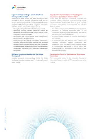 Laporan Pelaksanaan Tugas Komite Tata Kelola Terintegrasi Tahun 2024Selama tahun 2024, Komite Tata Kelola Terintegrasi telah menerbitkan laporan kegiatan pengawasan baik triwulan maupun tahunan yang mencakup hasil penelaahan terhadap pengelolaan tata kelola perusahaan yang baik, manajemen risiko, dan lain-lain dengan detail sebagai berikut:- Pencegahan dan perbaikan terkait potensi impairment.- Monitoring terhadap rencana pengajuan insentif ke Pemerintah terutama kepada WK marginal dengan tujuan mengurangi potensi impairment.- Pengawasan oleh Fungsi Internal Audit masing-masing Regional maupun Anak Perusahaan.- Dalam penerapan Risk Maturity Index (%u201cRMI%u201d) di Subholding Upstream, diperlukan dukungan, kolaborasi, dan kerjasama dari para Dewan Komisaris Regional dan Anak Perusahaan untuk secara ketat melakukan monitoring dan pengawasan aspek kinerja perusahaan untuk membantu realisasi RMI dengan baik.Kebijakan Remunerasi bagi Komite Tata Kelola TerintegrasiKebijakan pemberian remunerasi bagi Komite Tata Kelola Terintegrasi mengikuti kebijakan dari PT Pertamina (Persero) selaku Holding. Report on the Implementation of the Integrated Governance Committee's Duties in 2024During 2024, the Integrated Governance Committee has published quarterly and annual supervisory activity reports which include the results of the review of good corporate governance management, risk management, etc. with the following details:- Prevention and improvement related to potential impairment.- Monitoring of incentive submission plans to the Government, especially for marginal Working Area with the aim of reducing potential impairment.- Supervision by the Internal Audit Function of each Region and Subsidiary.- In implementing the Risk Maturity Index (%u201cRMI%u201d) in the Upstream Subholding, support, collaboration, and cooperation from the Regional and Subsidiary Boards of Commissioners are required to strictly monitor and supervise aspects of performance of the company to help realize the RMI properly.Remuneration Policy for the Integrated Governance CommitteeThe remuneration policy for the Integrated Governance Committee follows the policy of PT Pertamina (Persero) as the Holding. Laporan Tahunan %u2022 Annual Report 512HULU ENERGI