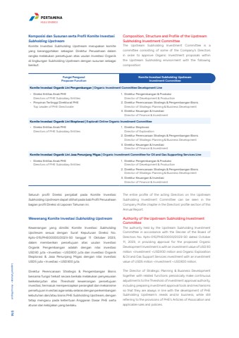 Seluruh profil Direksi penjabat pada Komite Investasi Subholding Upstream dapat dilihat pada bab Profil Perusahaan bagian profil Direksi di Laporan Tahunan ini. Wewenang Komite Investasi Subholding UpstreamKewenangan yang dimiliki Komite Investasi Subholding Upstream sesuai dengan Surat Keputusan Direksi No. Kpts-015/PHE00000/2023-S0 tanggal 11 Oktober 2023, dalam memberikan persetujuan atas usulan Investasi Organik Pengembangan adalah dengan nilai investasi USD30 juta